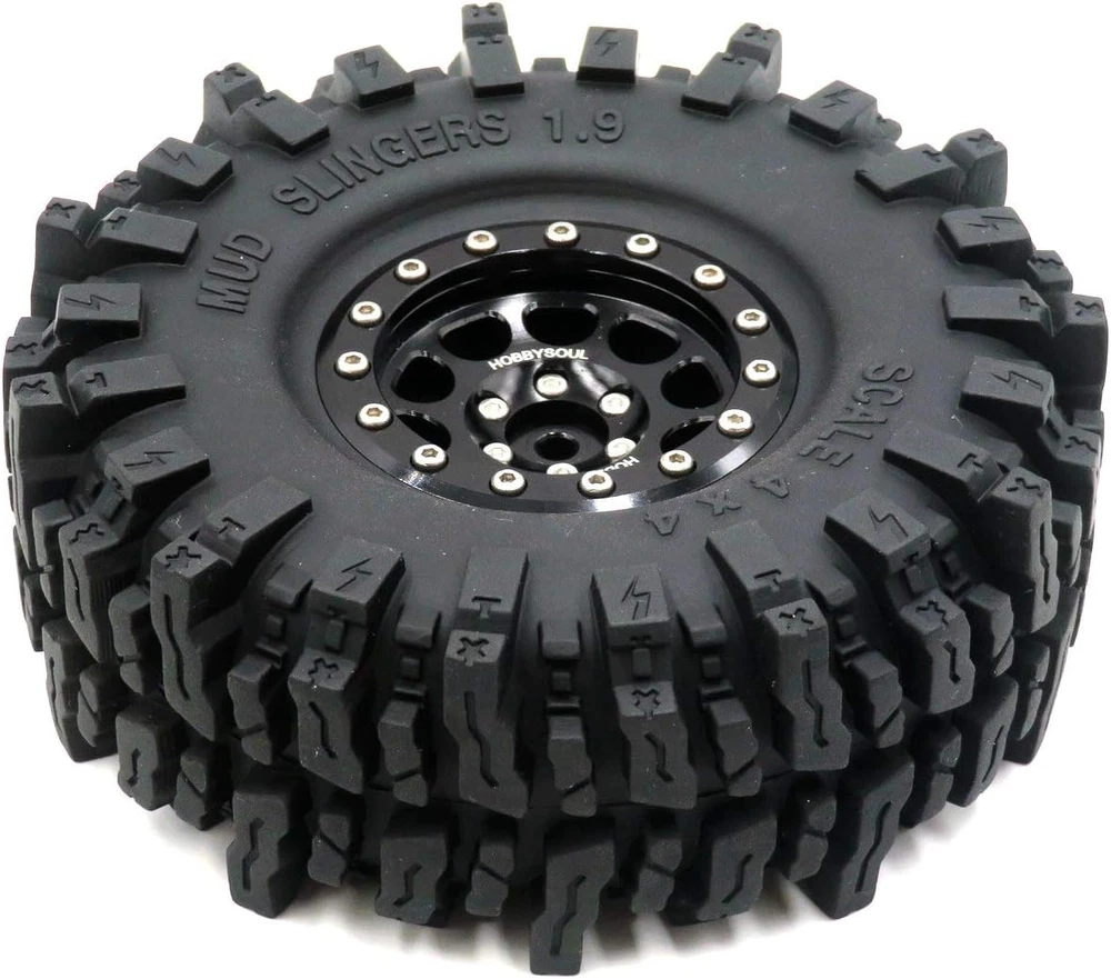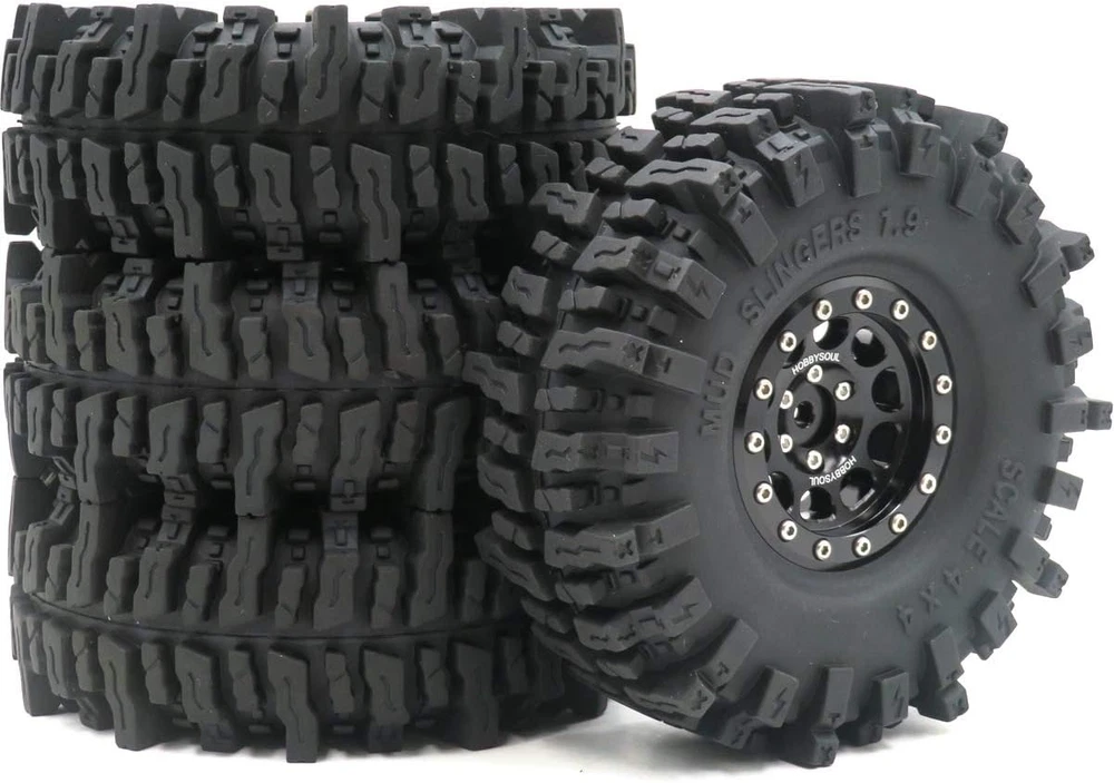 Made in the HOBBYSOUL Soft Sticky Compound tire with aluminum Wheel ( These tires better than common rubber that is good heat resistance and good cold resistance, high wear resistance and excellent durability. Sticky Soft compound delivers maximum gripping power for loose conditions - dry and loamy, or wet and muddy and rock Crawling, Design for professional RC crawler. ) 4pcs 1.9 Mud Slingers Tires + 4pcs 1.9 Aluminum Beadlock Wheels (Pre Assembled) Fit for Traxxas TRX4 / RC4WD D90 D110 TF2 / Tamiay CC01 / Axial SCX10 90047 SCX10 III AXI03007 / Redcat Gen8...... Tire diameter: about 120mm (4.72inch) / Tire Width: About 43mm (1.69inch) / Wheel hex: 12mm Total Weight: about 180g/pc (1pc beadlock wheel + 1pc tire with foam) If just need 1.9 mud slingers tires, please purchase the 4pcs tires ASIN: B08B42PVV9 or 5pcs tires ASIN: B08LGWLSQJ . Product Description TIRE HEIGHT & WIDTH Tires Height: 4.72'' (120mm) is perfect for scale crawlers that want maximum ground clearance and unmatched rock crawling performance, giving you the height you need to tackle any obstacles and give you the optimum in handling;Tires Width: 1.69'' (43mm) is super grip and suitable for a variety of terrains TIRE TREAD PATTERN These RC 1.9 tires have larger tread delivers maximum gripping power for loose conditions ( fit for dry / loamy / wet / muddy / Rock crawling / Swampers / Badland Terrain), the SOFT COMPOUND and LARGER LUGS, DEEPER VOIDS TREADS and SIDE CLEATS enhanced the performance in mud and rock crawling. TIRE MATERIAL HOBBYSOUL Soft Compound Tire (with foam insert), good heat resistance and good cold resistance, give you the optimum in handling, durability and longevity. WHEEL Aluminum 1.9 Beadlock wheel consists of 5 parts, easy to remove and change the tires; Aluminum anodic oxidation sleek surface, longevity and beautiful appearance. MULTI-TERRAIN