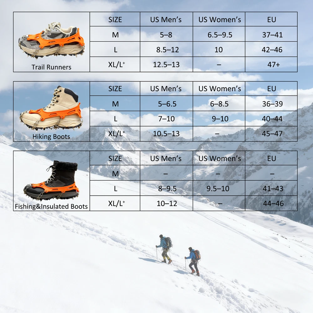 【SUPERIOR TRACTION WITH 19 SPIKES】Equipped with 19 premium manganese steel spikes and durable 201 stainless steel chains, these ice cleats and crampons provide superior grip and stability on snow, ice, mud, and rocky terrain—reducing slips and falls for safer adventures 【DURABLE & SAFE MATERIAL】The TPE harness endures -49°F (-45°C) with exceptional elasticity and tear resistance. It offers a secure, close fit over most shoes and boots—ideal ice cleats for shoes and boots and crampons that ensure long-lasting performance 【ADJUSTABLE & EASY TO WEAR】Features 30cm adjustable hook-and-loop straps for quick fitting and removal. These mens cleats, microspikes for hiking, and crampons stay firmly in place, delivering reliable traction whether climbing hills or running on icy roads 【COMPACT & PORTABLE DESIGN】Lightweight at only 0.5kg, with a 20×23cm carry bag for convenient storage. Remove and store easily without scratching indoor floors—perfect climbing spikes, boot chains, and crampons for travel, work, or everyday use 【MULTI-PURPOSE WINTER GEAR】Ideal for hiking, trekking, shoveling snow, ice fishing, or mountain climbing. These all-terrain crampons, ice cleats, and climbing gear suit teens, adults, and seniors—great gifts for outdoor enthusiasts and winter explorers