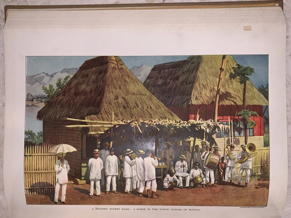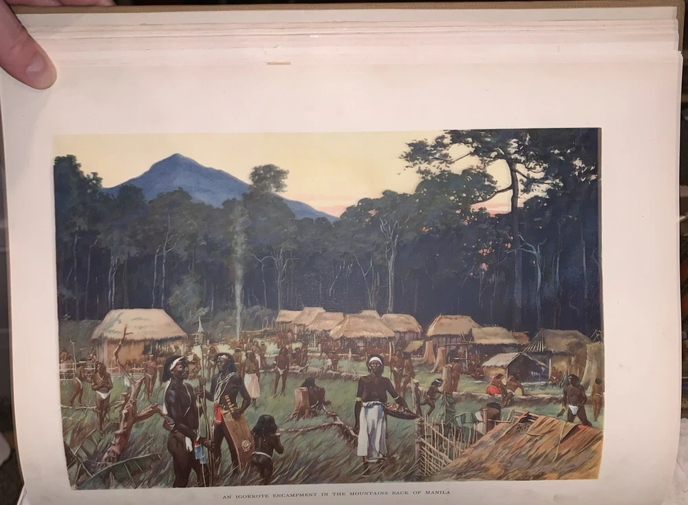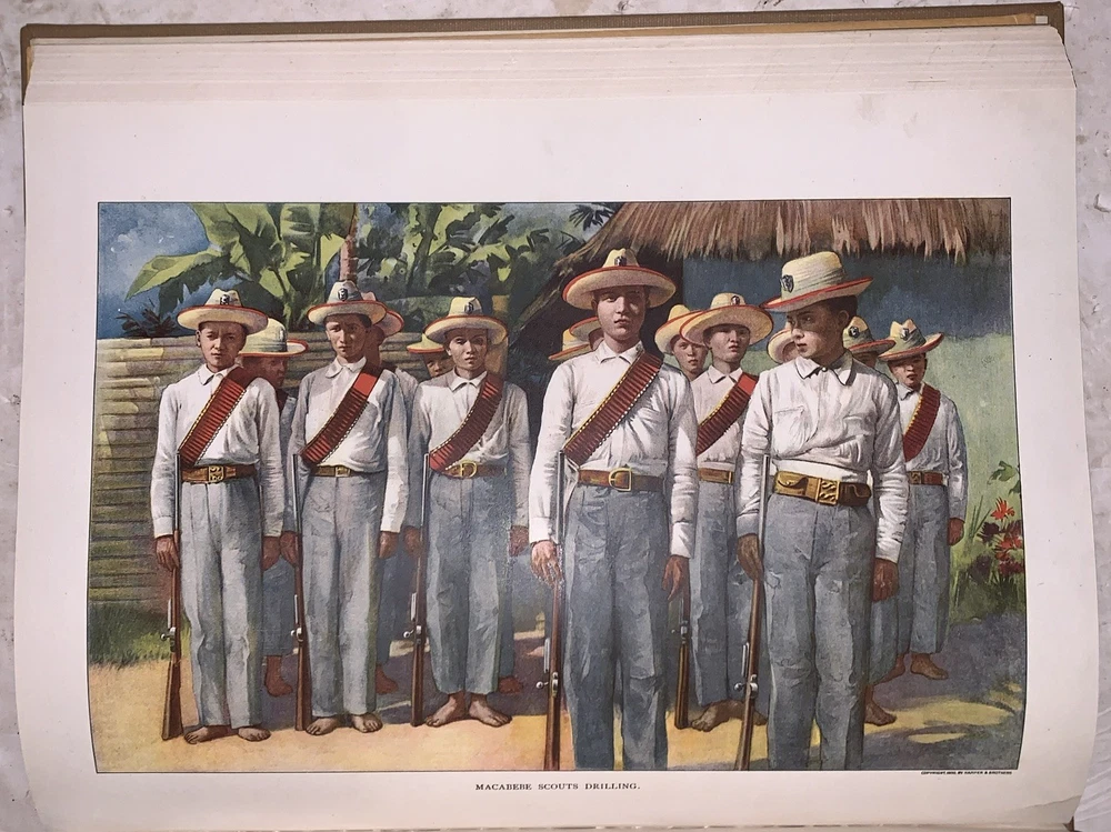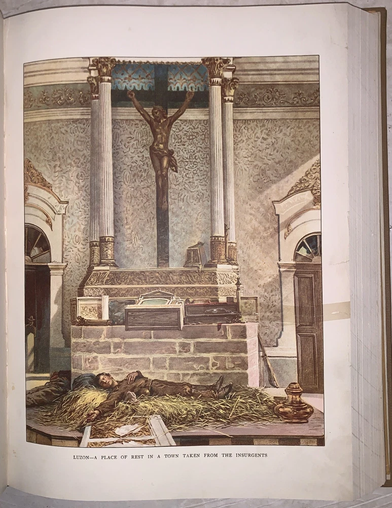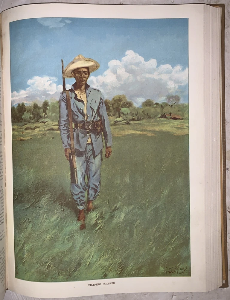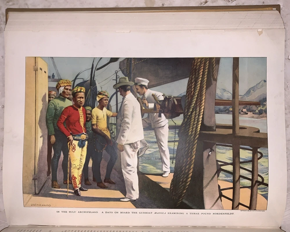 Harper's History of the War in the Philippines Edited by Marrion Wilcox, B.A., LL.B. Illustrated New York and London: Harper & Brothers 1900 First Edition Large folio, 464 pages, professionally rebound in full tan cloth covered boards with gilt lettered spine label. Illustrated throughout with full-page color plates, also in black and white. It appears that the last few pages are detached, with large losses and laid in at the rear, may lack a few leaves, numerous tears and tape repairs, some discoloration, else in good condition. 15" x 12" x 2". This auction has no reserve, an opening bid of only $0.01, and free shipping. If you have any questions, feel free to ask, and don't forget to check out my other listings.