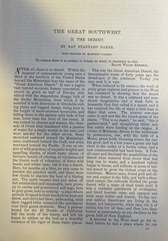 Vintage magazine illustrations removed from a bound volume . 1902. Contains 11 pages and 4 illustrations. Page size approximately 6 inches x 9 inches. Would be great for addition to any vintage paper collection. SKU # 18387 Nice article overall. Has some browning, age toning, and dinged corners, but overall very nice for a 100-year-old magazine article. Maxfield Parrish was one of the preeminent illustrators of the 20th century. He traveled throughout Europe with his parents in the 1880s, studying architecture and the works of the masters in European museums. When he returned to the United States, he studied at the Pennsylvania Academy of Fine Arts and the Drexel Institute. By the turn of the century, Maxfield Parrish’s illustrations were featured in many top magazines, including Harper’s Bazar, Scribner’s, McClure’s, Century Magazine, Hearst’s, Collier’s, Life Magazine, and more. In 1902, he illustrated a series of articles on the Great Southwest for Century Magazine. Two years later, he created the illustrations that accompanied Edith Wharton’s series of articles on Italian Villas. Parrish illustrated many children’s books, among them L. Frank Baum’s Mother Goose in Prose, published in 1905; The Arabian Nights, Their Best-Known Tales in 1912; Tanglewood Tales in 1910; and The Knave of Hearts in 1925. He also created dozens of stunning advertisements for some of America’s top brands, including Jell-O, Hires soft drinks, Mazda Lamps, Colgate, Royal Baking Powder, Ferry Seeds, and more.