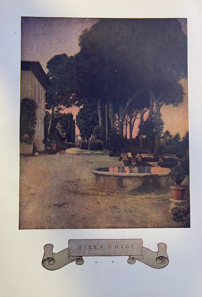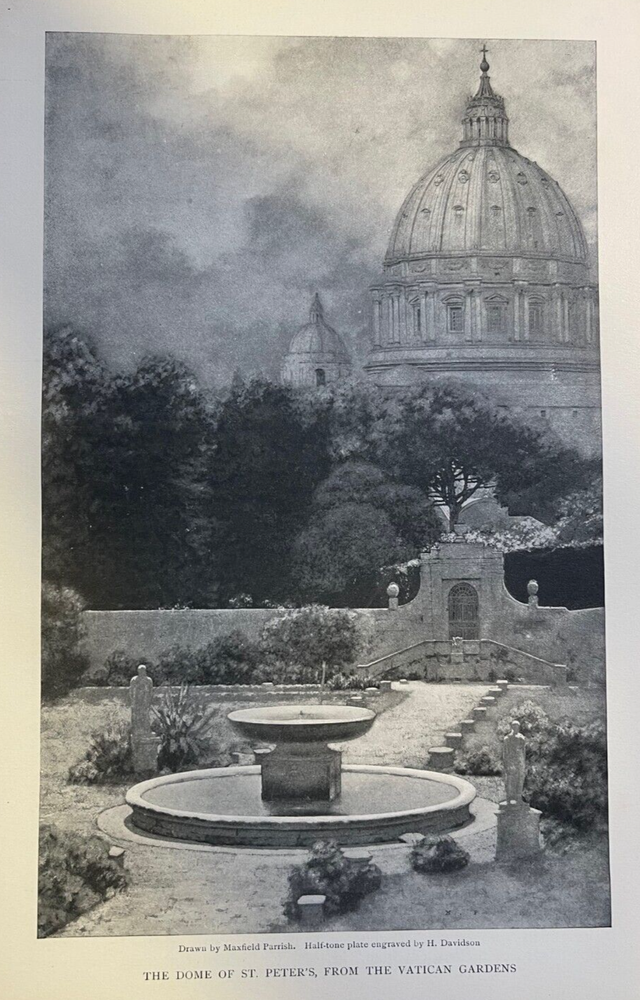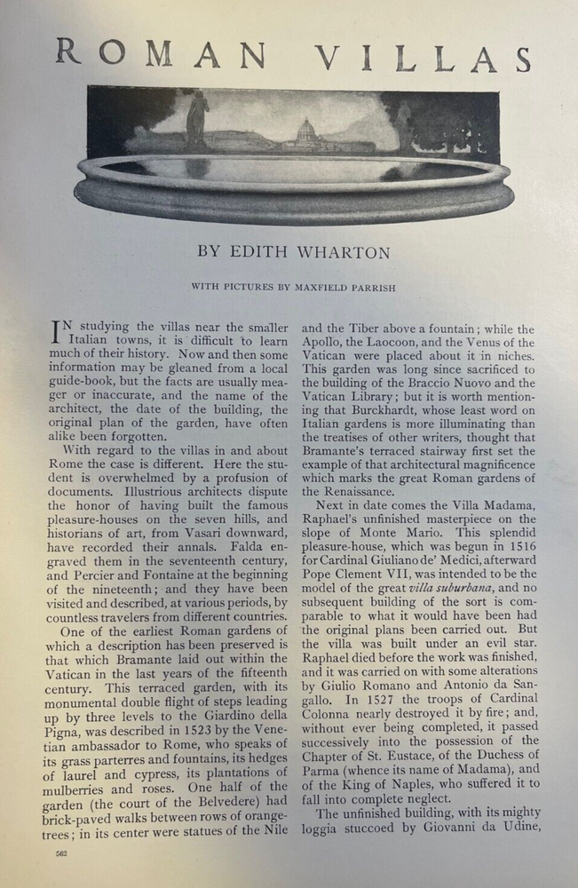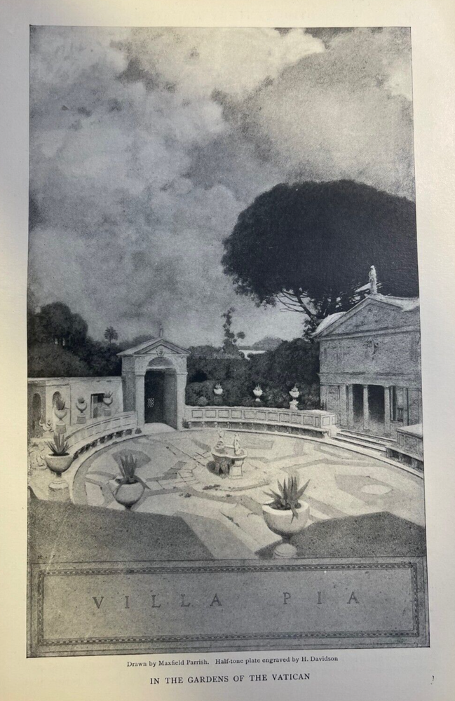 Vintage magazine illustrations removed from a bound volume . 1904. Contains 13 pages and 4 Parrish illustrations. Page size approximately 6 inches x 9 inches. Would be great for addition to any vintage paper collection. SKU # 18483 Nice article overall. Has some browning, age toning, and dinged corners, but overall very nice for a 100-year-old magazine article. Maxfield Parrish was one of the preeminent illustrators of the 20th century. He traveled throughout Europe with his parents in the 1880s, studying architecture and the works of the masters in European museums. When he returned to the United States, he studied at the Pennsylvania Academy of Fine Arts and the Drexel Institute. By the turn of the century, Maxfield Parrish’s illustrations were featured in many top magazines, including Harper’s Bazar, Scribner’s, McClure’s, Century Magazine, Hearst’s, Collier’s, Life Magazine, and more. In 1902, he illustrated a series of articles on the Great Southwest for Century Magazine. Two years later, he created the illustrations that accompanied Edith Wharton’s series of articles on Italian Villas. Parrish illustrated many children’s books, among them L. Frank Baum’s Mother Goose in Prose, published in 1905; The Arabian Nights, Their Best-Known Tales in 1912; Tanglewood Tales in 1910; and The Knave of Hearts in 1925. He also created dozens of stunning advertisements for some of America’s top brands, including Jell-O, Hires soft drinks, Mazda Lamps, Colgate, Royal Baking Powder, Ferry Seeds, and more.