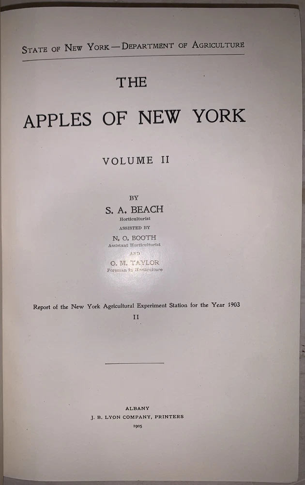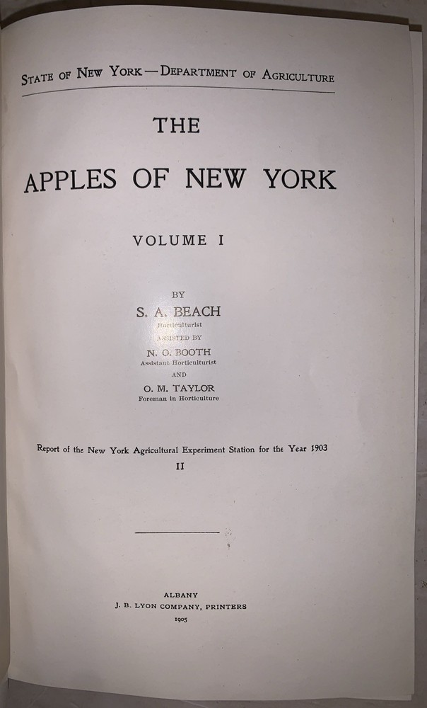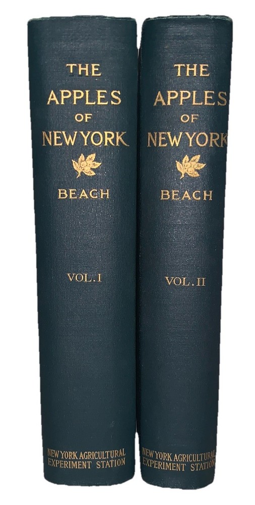 State of New York - Department of Agriculture The Apples of New York In Two Volumes by S. A. Beach Assisted by N. O. Booth and O. M. Taylor Report of the New York Agricultural Experiment Station for the Year 1903 Albany: J. B. Lyon Company 1905 First Edition Two octavos, xx, 409pp.; iv, 360 pages, publisher's original gilt-lettered and decorated green cloth covered boards. Illustrated throughout with color plates, also in black and white. Previous owner's inscription, minor rubbing and wear, else in very good condition. If you have any questions, feel free to ask, and don't forget to check out my other listings.
