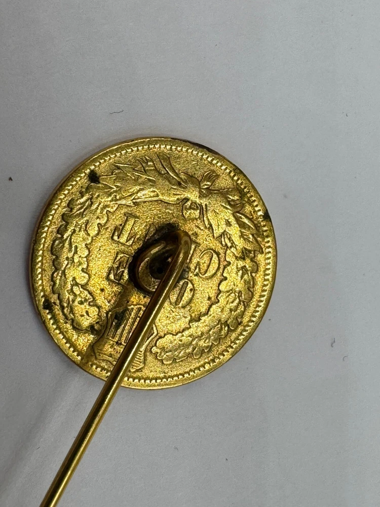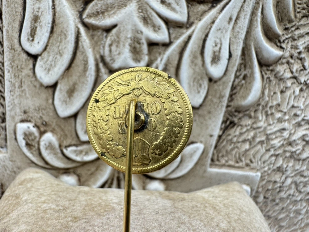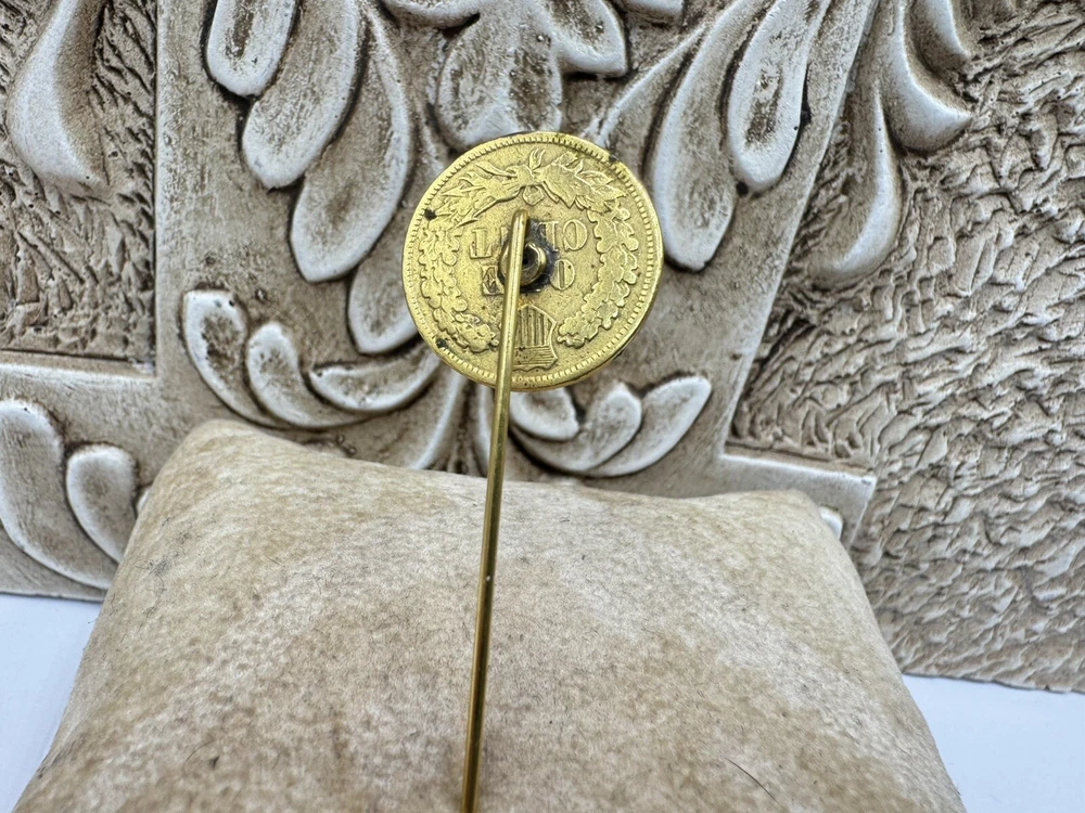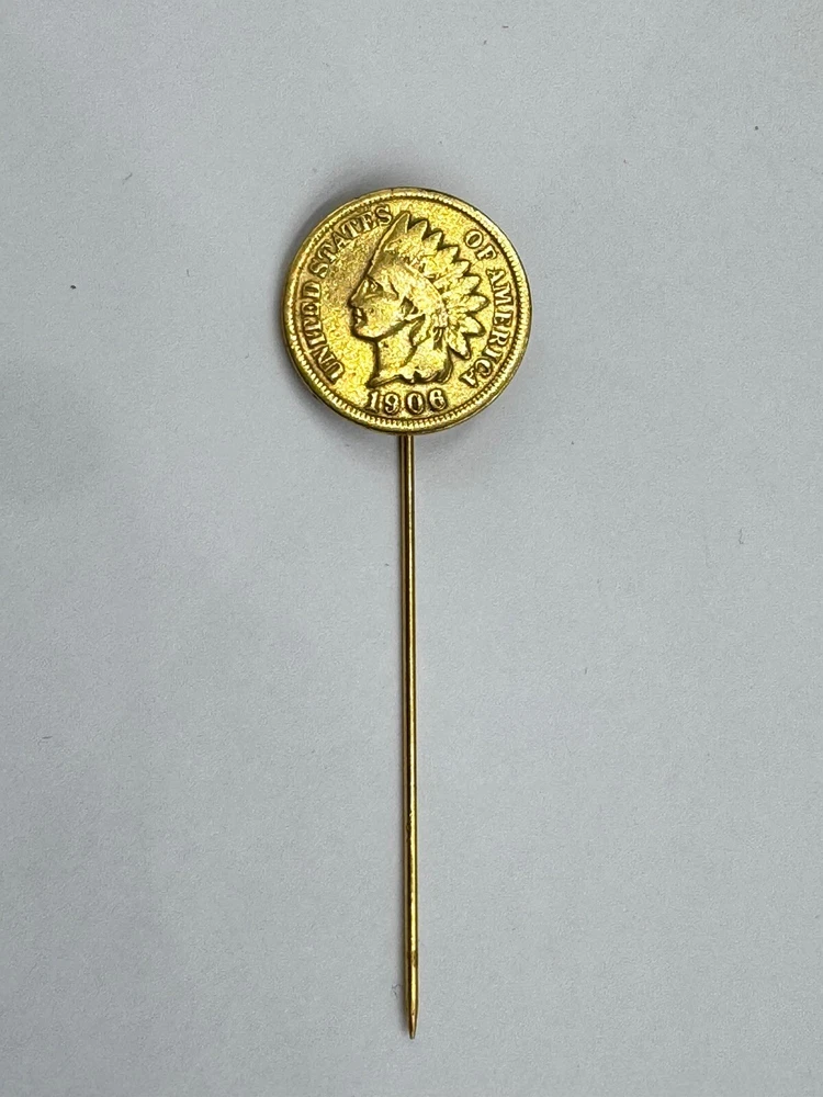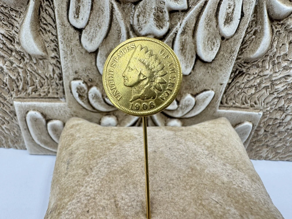 This vintage stick pin features a 1906 Indian Head Cent penny as the centerpiece, set in a round golden metal frame. It is a unique piece of coin jewelry with a classic antique design. The stick pin is suitable for various occasions like engagements, anniversaries, birthdays, and Father's Day. It carries a vintage charm and is ideal for both men and women who appreciate beauty and art in their accessories. Great for a coin collector, just something cute.. In great condition. We do combine shipping.