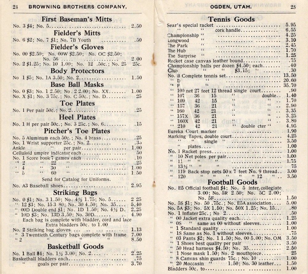 1907 Browning Brother's cover Ogden, Utah with 40 page catalog (3 1/2 x 6 inches) - guns, fishing, hunting gear, tents, cartridges, dog supplies, Kodak cameras, & sporting goods (football, baseball, tennis, etc.). Sent to S. R. Buford at Virginia City, Montana. Stain on front & back of cover. Firearms, rifles, shotguns, pistols, Winchester, Remington, Marlin, Smith, Parker, Ithaca, Baker, Stevens, Savage, Hopkins & Allen, Hamilton, Colt, Smith & Wesson, Iver Johnson, Harrington & Richardson. UT, MT, Mont. FREE Shipping .