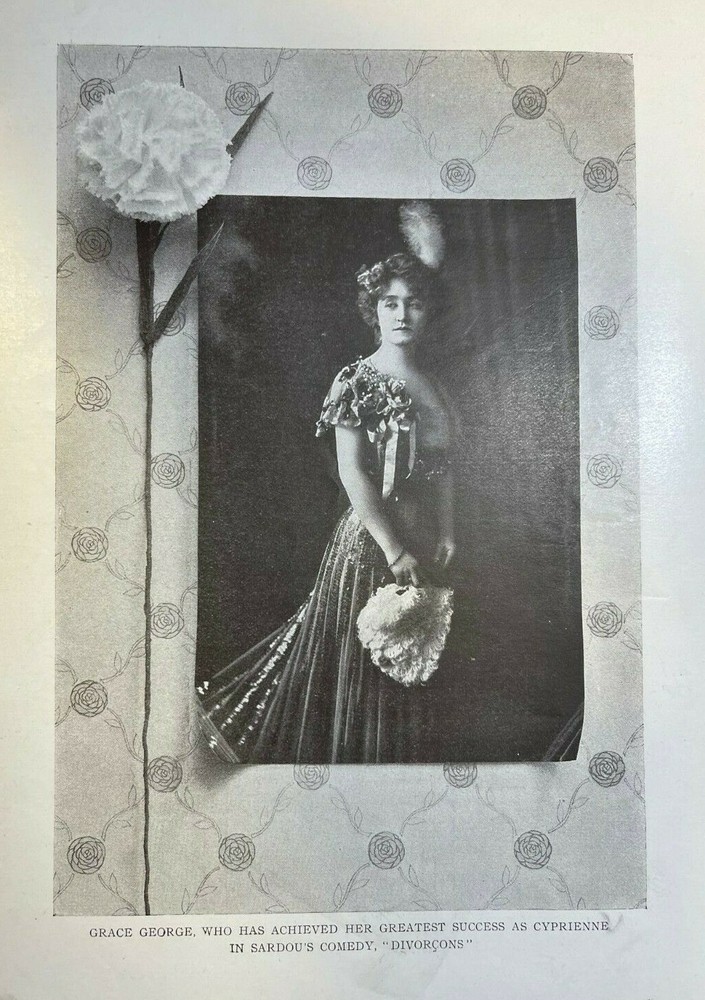 1907 Antique Magazine Illustration – Vintage Print – Historical Artwork Step back in time with this authentic 1907 vintage magazine illustration , carefully preserved from a historic publication. This original antique print features exquisite detail and craftsmanship, making it an ideal addition for collectors, history buffs, and art lovers alike. Item Details: Date: 1907 Original vintage illustration (single page) Page size: Approx. 6” x 9” Condition: Well-preserved for its age, with expected age toning, light browning, and minor corner wear. Perfect For: Vintage ephemera & paper collectors Framing & home decor – add antique charm to any space Scrapbooking & journaling – unique historical piece Genealogy & historical research SKU # 34538 A genuine piece of history, ready for display or creative projects. Ships with care and protection. Grace George was a leading actress of the American stage in the late 19th and early 20th centuries, known for her remarkable talent, commanding presence, and versatility, performing dramatic and comedic roles. She made her Broadway debut in 1894 in The Senator. One of her most memorable performances came in 1905 when she starred in Divorçons, a French farce that allowed her to exhibit her comedic timing while bringing depth to lighthearted characters. Critics praised her elegant portrayal of strong-willed women. One of her biggest successes was in The Truth (1907). Grace’s performance as a woman caught in a web of lies was hailed for its emotional intensity, with one critic calling her “irresistibly charming” and “a master of her craft.” Her work in The White Sister (1909) further solidified her reputation for conveying deep emotion and sincerity on stage. She had a long-running career, performing in major productions until the 1930s, and was one of Broadway’s finest leading ladies. Offstage, Grace was more reserved than many of her contemporaries. She married producer William A. Brady in 1899, a partnership that was both romantic and professional. Brady produced many of her shows, and their marriage was seen as a powerful alliance in the theater world. Brady was known for his high-powered personality and often clashed with Grace over the direction of her career. Though their marriage lasted until Brady’s death in 1950, there were rumors throughout their relationship of tension and affairs, though nothing was ever confirmed. She remained active in the theater well into her later years and passed away in 1961.