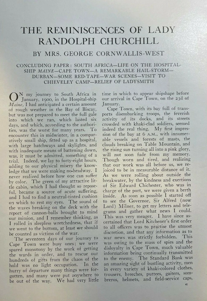 Vintage magazine article removed from a vintage magazine published in 1908. Contains 16 pages and 10 illustrations. Page size approximately 6 inches x 9 inches. Would be great for any vintage paper collection. SKU # 33002 Nice article overall. Has some browning, age toning, and dinged corners, but overall very nice. Lady Randolph Churchill, born Jennie Jerome, an American socialite took British society by storm. She married Lord Randolph Churchill in 1874 and became a political force in her own right. Her son, Winston Churchill led Britain through World War II. Jennie helped propel her husband’s career, hosting glittering gatherings that drew Britain’s most powerful figures. After Lord Randolph’s death in 1895, Jennie remained a force in British society. She helped launch The Anglo-Saxon Review, a short-lived but stylish literary magazine. Lady Randolph died in 1921 at 67.