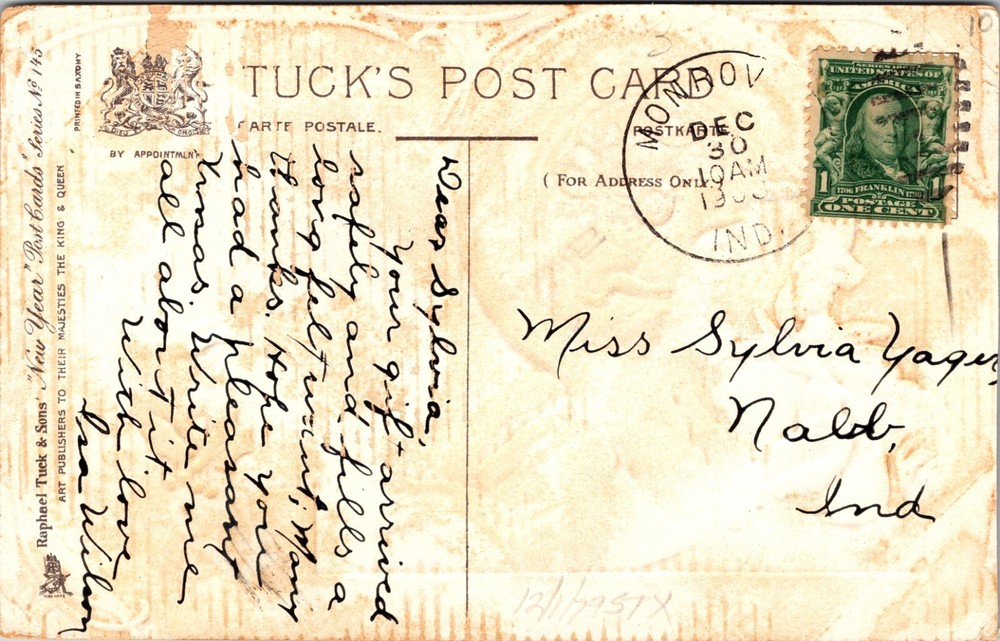 Celebrate the dawn of a new era with this exquisite 1908 New Year's Postcard from the renowned Raphael Tuck & Sons. Featuring a stylish lady out in snowy weather to adjust the clock’s hands to midnight, this postcard captures the spirit of celebration and the passage of time. Printed in Germany, it reflects the artistry and craftsmanship of early 20th-century lithography. The piece is a standard-sized (5.5 x 3.5 in) original from the Divided Back era, making it a perfect collectible or a thoughtful gift for someone who appreciates the charm of historical holiday memorabilia. It's a single unit sale, with the back bearing evidence of its journey through time, stamps, and possibly a personal message from a century ago.