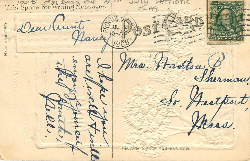 Home1908 embossed 4th of July Patriotic Flag artist impression Postcard 26-3750