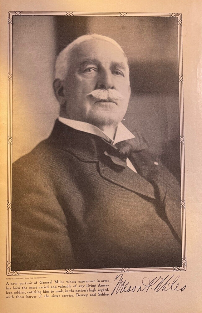 1910 Antique Magazine Illustration – Vintage Print – Historical Artwork Step back in time with this authentic 1910 vintage magazine illustration , carefully preserved from a historic publication. This original antique print features exquisite detail and craftsmanship, making it an ideal addition for collectors, history buffs, and art lovers alike. Item Details: Date: 1910 Original vintage illustration (single page) Page size: Approx. 6” x 9” Condition: Well-preserved for its age, with expected age toning, light browning, and minor corner wear. Perfect For: Vintage ephemera & paper collectors Framing & home decor – add antique charm to any space Scrapbooking & journaling – unique historical piece Genealogy & historical research SKU #18597 A genuine piece of history, ready for display or creative projects. Ships with care and protection. Nelson Miles was one of those larger-than-life figures who played a key role in a series of conflicts between the United States and various Native American tribes during the late 19th century. Born in 1839, Miles joined the Union Army during the Civil War and quickly rose through the ranks. By the time the Indian Wars were in full swing, he was a seasoned commander with a reputation for getting things done. But don’t let his stern military demeanor fool you—Miles was also known for his diplomacy and sometimes even empathy toward his adversaries. One of the most famous episodes involving General Miles was the capture of the Apache leader Geronimo in 1886. Geronimo had eluded capture for years, leading a small band of warriors in a guerrilla campaign against settlers and the U.S. Army. Miles took over the campaign after previous efforts had failed, and through a combination of military pressure and negotiation convinced Geronimo to surrender. This marked the end of the Apache resistance, and was a major feather in Miles’s cap. Miles was also involved in the Nez Perce War of 1877, which saw him face off against Chief Joseph. The Nez Perce were trying to escape to Canada to avoid being forced onto a reservation. They led the U.S. Army on a dramatic chase through the Rocky Mountains, and Miles played a key role in finally cornering and capturing Chief Joseph, who famously declared, "I will fight no more forever." Despite his successes, Miles’s legacy is complicated. He effectively carried out the U.S. government’s policies, which aimed to subdue Native American tribes and open their lands to settlers. Unfortunately, his campaigns contributed to the suffering and displacement of thousands of Native Americans. Interestingly, after his military career, Miles became an advocate for Native American rights, pushing for better treatment and conditions for the very people he had once fought against. It’s a twist that adds depth to his character, showing he wasn’t a heartless conqueror. In the end, General Nelson Miles played a pivotal role in a turbulent chapter of American history. Whether seen as a hero or a villain, there’s no denying that his actions had a lasting impact on the country’s westward expansion.