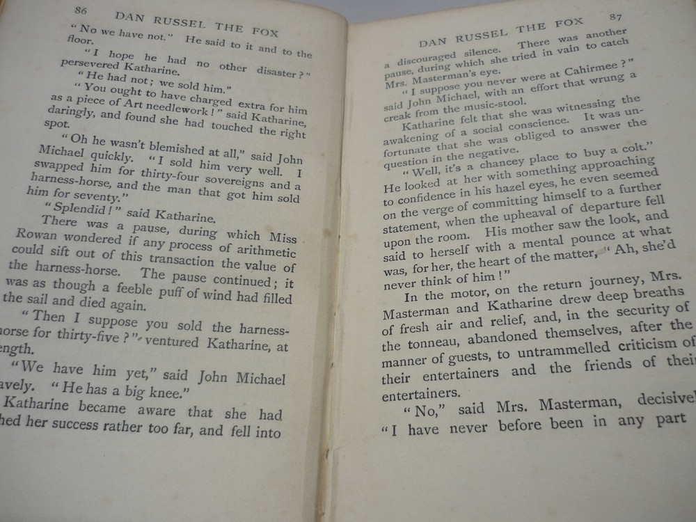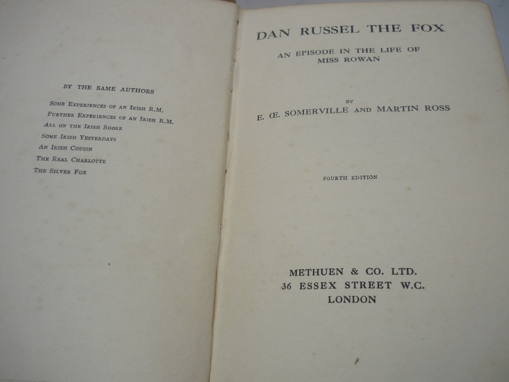 Contact Us Visit Our Store Home About Us Shipping Returns Contact Us View Feedback Dan Russel The Fox - An Episode in the Life of Miss Rowan by E O E Somerville and Martin Ross Decorative hardback fourth edition published in 1911 by Methuen & Co 340 pages with tanning/foxing. Some marks on pastedown and f.e.p, ink ownership on the f.e.p. Boards rubbed and bumped with tears and fraying on spine edges. Corners bumped and scuffed. Home About Us Shipping Returns Contact Us View Feedback