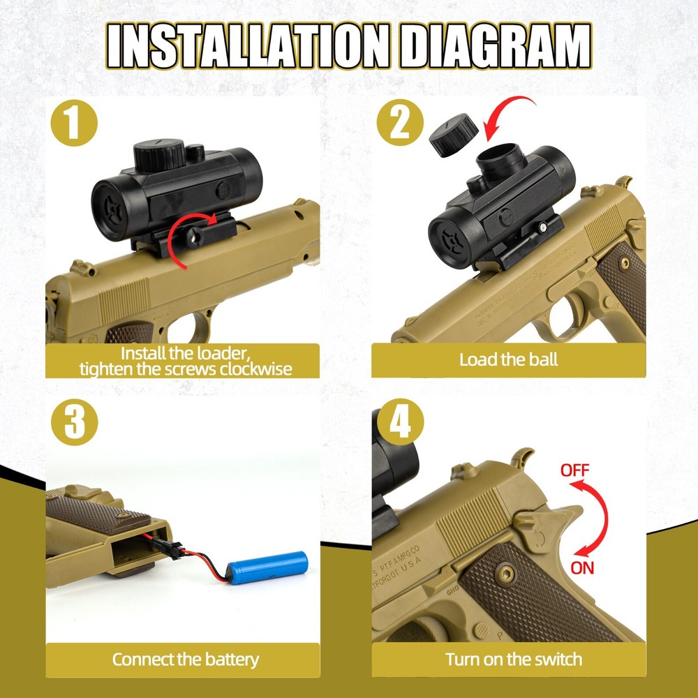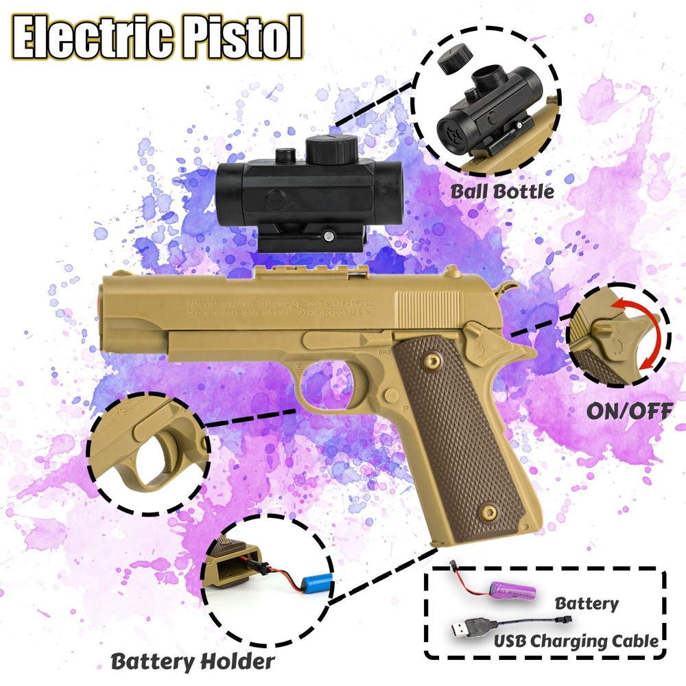 Water beads should be kept away from children under 5 years of age, and older children or vulnerable adults should use them under close adult supervision only. Water beads expand and can block the gastrointestinal passage when swallowed, which can cause choking. Learn more about water beads The 1911 Gel Blaster Electric Splatter Ball Toy Gun is a rechargeable tactical gun designed for outdoor play. This gel blaster gun features automatic fire capabilities, making it an exciting and interactive toy for children and adults alike. With its sleek design and powerful performance, this toy gun provides hours of fun and entertainment in any outdoor setting.