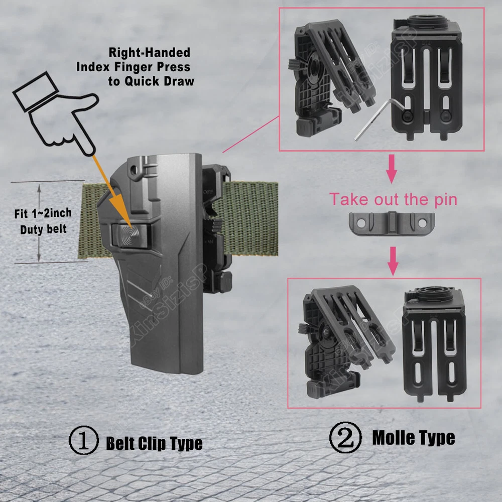 High Quality Military & Police Grade Polymer OWB Holster Specially Designed For Fast Draw During Duty Or Shooting Competition. Weapon Compatibility - Outside Waistband Tactical H olster for Non-Railed Versions of 1911 Models (For 9mm, .40 only). Holster fit 1911 Holster fit Dan Wesson Dan Wesson Specialist 5" 9mm Luger Dan Wesson Guardian 4.25" 9mm Luger 1911 Holster fit Ed Brown Ed Brown Special Forces 5" 9mm Luger Ed Brown Kobra Carry 4.25" 9mm Luger 1911 Holster fit Kimber Kimber 1911 5" 9mm Luger Kimber 1911 Pro 4" 9mm Luger Kimber Custom II 5" .40 S&W Kimber Pro Carry II 4" .40 S&W 1911 Holst er fit Nighthawk Custom Nighthawk Custom Talon 5" 9mm Luger 1911 Holste r fit Rock Island Armory (Armscor) Rock Island Armory 1911 Ultra FS 5" 9mm Luger Rock Island Armory 1911 FS Tactical 5" .40 S&W 1911 Hols ter fit Springfield Springfield 1911 EMP Champion 4" 9mm Luger Springfield 1911 Loaded 5" 9mm Luger Springfield Armory 1911 Loaded 5" .40 S&W Springfield Armory 1911 Loaded Target 5" .40 S&W 1911 Hols ter f it STI International (Staccato) STI Trojan 5" . 9mm Luger 1911 Hols ter fit Taurus Taurus 1911 5" 9mm Luger Taurus 1911 Commander 4.2" 9mm Luger 1911 Holste r fit Walther Walther Colt 1911 A1 5" .22 LR 1911 Holste r fit Wilson Combat Wilson Combat CQB 5" 9mm Luger ( I t perfect fit the 1911 gun without Optic Mount Mini Sight a bove on the end of the barrel , but also without laser and embedded chassis, and flashlight style ) Ease And Comfort Push side buttons to achieve the fast opening and closing, unique design allows for belt carrying or vest carrying, perfectly used by duty holsters, uniformed law enforcement officers, security personnel, military personnel, private persons, and shooting sports holsters. And it fits closer to the body which can achieve better concealment under clothes. High S afety Secure Level II Retention - Auto-locking system restrain pistol in the holster to ensure ultimate safety, activate the release by pressing the button with the index finger to achieve gun access Adjustable Easily set Holster 360 degrees to your desire position with Allen key, compatible belt width up to 2 inch Tough & Durable Material Custom-molded body made of polymer stronger than leather that will wear out, adapt to every bad environment In the Package: · 1*Holster with Paddle Attachment · 1*Allen Key Shipping: Ships same day or next except Sundays and Holidays ! Free shipping! Ship by USPS First Class Package. 100% MONEY BACK GUARANTEE. Any question please be free to contact with us First .Thanks!