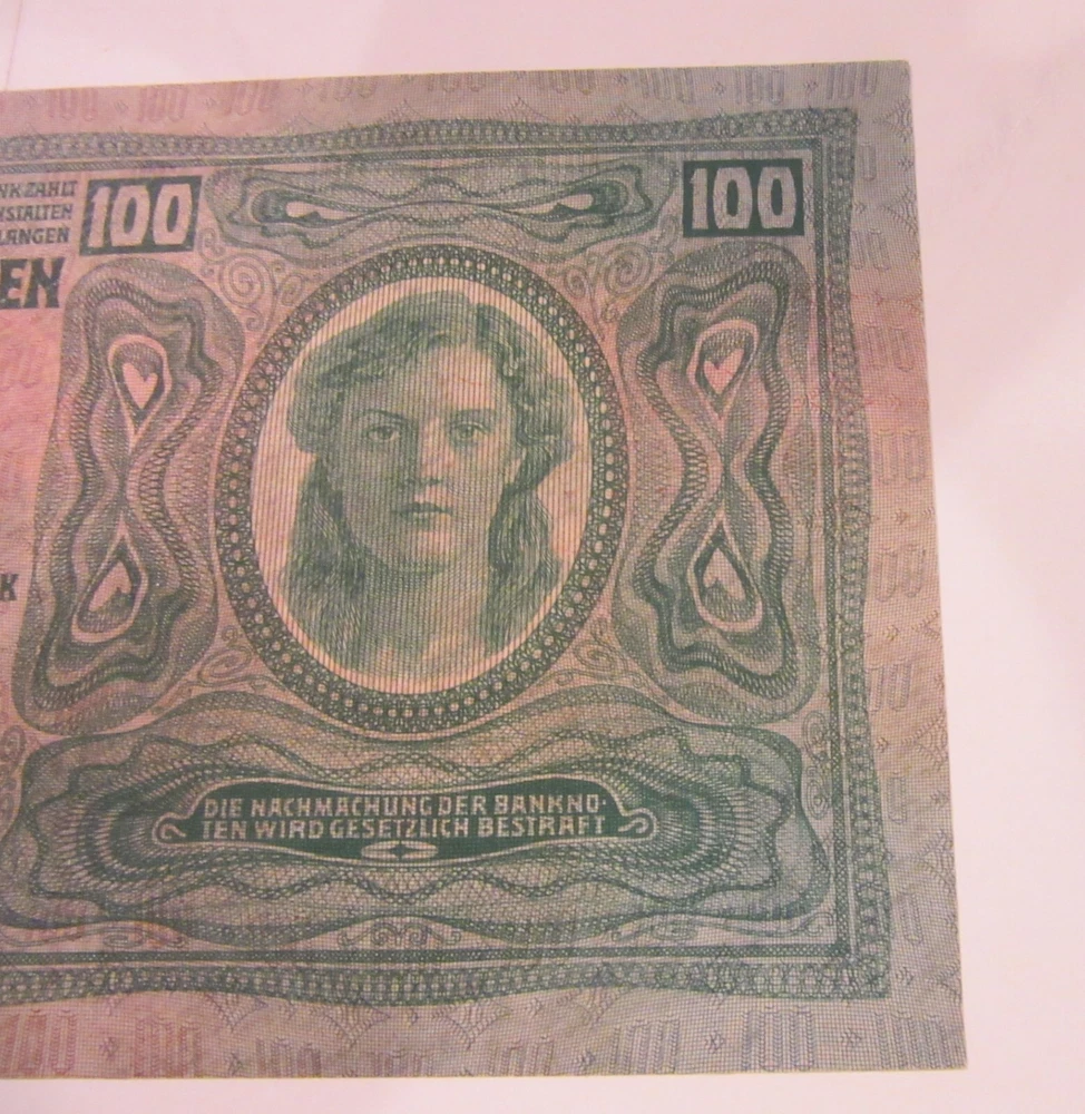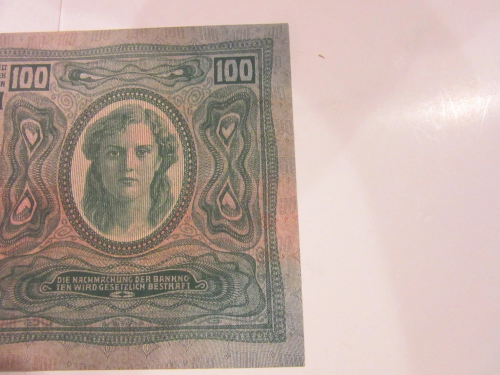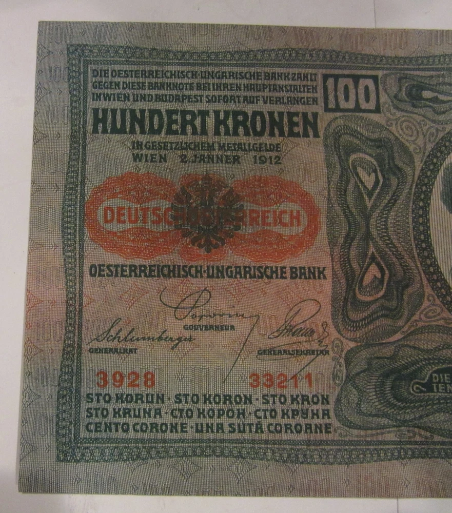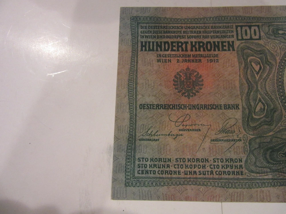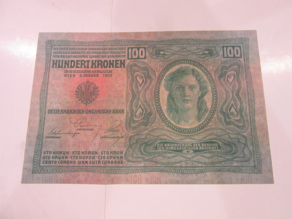1912 Austria Hungarian Bank Banknote 100 Kroner Amazing Condition Really nice 100 Kroner banknote. Dated 1912. 4.25 by 6.5 inches. Extraordinary condition. Looks and feels uncirculated. Part of a 400 piece collection of 1915 to 1925 eastern European and Russian banknotes. $1.35 shipping in United States. I’ll be listing about 45 from this series so shipping discounts for multiple purchases.