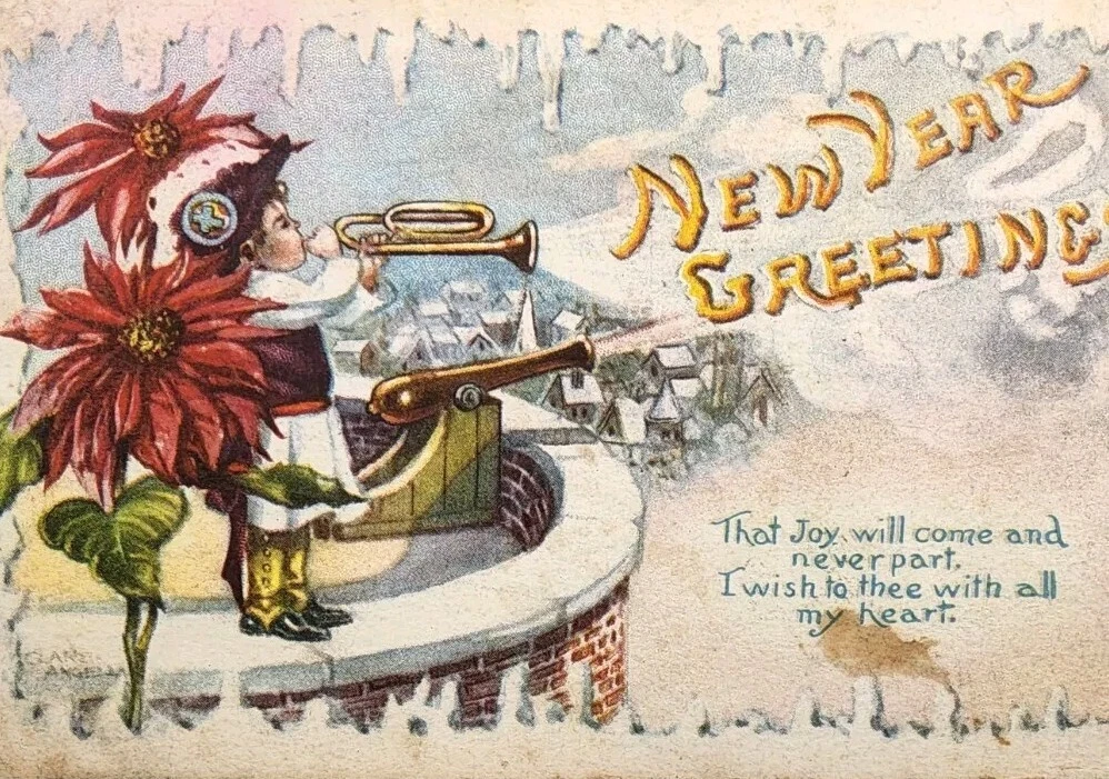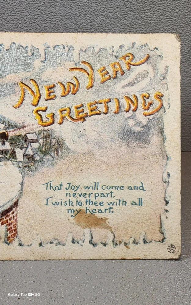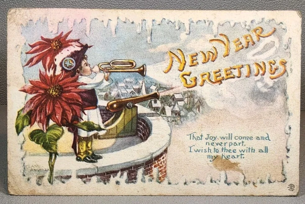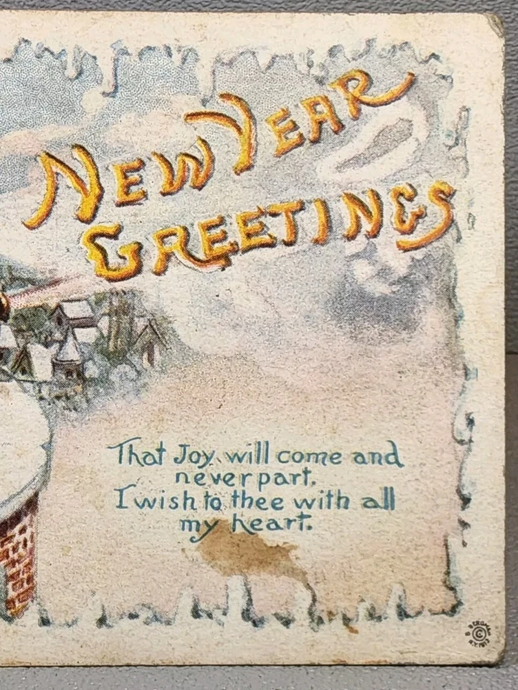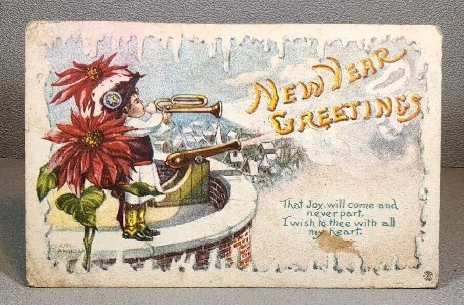 1912 New Years Greetings Picture Postcard ~ New Year Greetings ~ #-5793. Vintage New Year Greetings Picture Postcard is a used standard size postcard. Postcard shows some wear with some spotting. Postcard was copyrighted in 1912 by: S. Bergman of the USA. Postcard is Artist Signed. Nice Used Vintage New Year Greetings Postcard. See pictures for condition information and card details.