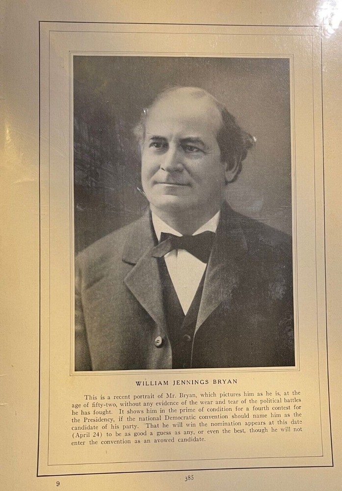 1912 Antique Magazine Illustration – Vintage Print – Historical Artwork Step back in time with this authentic 1912 vintage magazine illustration , carefully preserved from a historic publication. This original antique print features exquisite detail and craftsmanship, making it an ideal addition for collectors, history buffs, and art lovers alike. Item Details: Date: 1912 Original vintage illustration (single page) Page size: Approx. 6” x 9” Condition: Well-preserved for its age, with expected age toning, light browning, and minor corner wear. Perfect For: Vintage ephemera & paper collectors Framing & home decor – add antique charm to any space Scrapbooking & journaling – unique historical piece Genealogy & historical research SKU #16810 A genuine piece of history, ready for display or creative projects. Ships with care and protection. William Jennings Bryan ran for president three times (1896, 1900, and 1908) but never won. Known as the “Great Commoner,” he supported farmers and workers and fought for issues like the free coinage of silver. His Cross of Gold speech defended silver over gold as the nation’s currency. Bryan also backed progressive reforms, supporting the income tax, women’s suffrage, and the direct election of senators. Even though he never became president, he influenced the Democratic Party’s direction. Later, Bryan served as Secretary of State under President Woodrow Wilson but resigned when the U.S. entered World War I. In his final years, he became a leading figure in the anti-evolution movement, arguing against teaching evolution in schools during the 1925 Scopes trial.