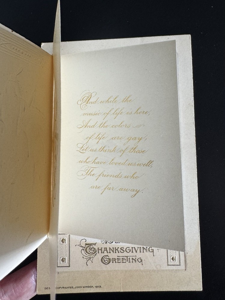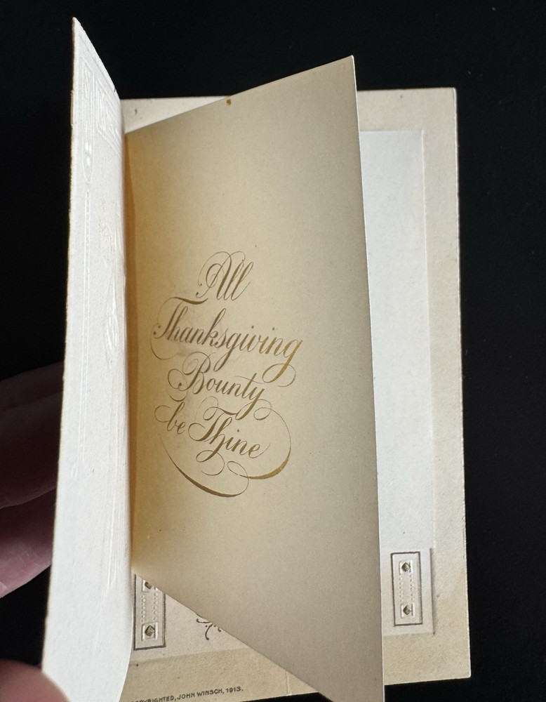 Era:Divided Back (1907-1915)Type:Printed (Lithograph)Country of Origin:GermanyPostage Condition:PostedSubject:ThanksgivingTime Period Manufactured:1900-1919Features:EmbossedOriginal/Licensed Reprint:OriginalUnit of Sale:Single UnitYear Manufactured:1912Size:Standard (5.5 x 3.5 in)Brand/Publisher:John WinschNumber of Items in Set:1Theme:HolidayOccasion:Thanksgiving