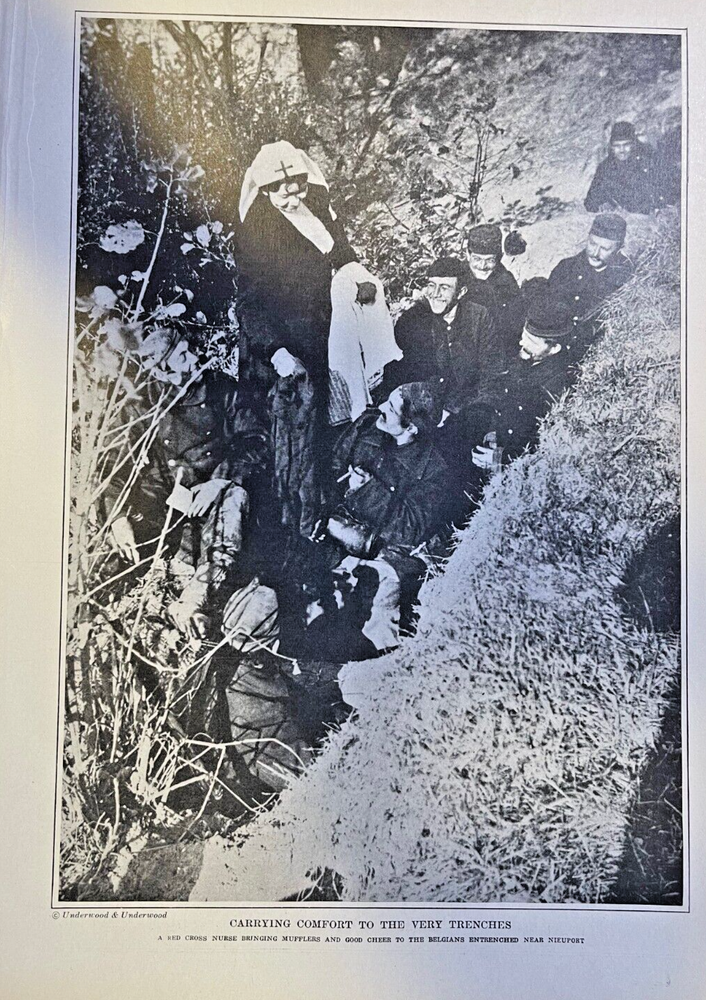 1914 Antique Magazine Illustration – Vintage Print – Historical Artwork Step back in time with this authentic 1914 vintage magazine illustration , carefully preserved from a historic publication. This original antique print features exquisite detail and craftsmanship, making it an ideal addition for collectors, history buffs, and art lovers alike. Item Details: Date: 1914 Original vintage illustration (single page) Page size: Approx. 8” x 12” Condition: Well-preserved for its age, with expected age toning, light browning, and minor corner wear. Perfect For: Vintage ephemera & paper collectors Framing & home decor – add antique charm to any space Scrapbooking & journaling – unique historical piece Genealogy & historical research SKU #A247 A genuine piece of history, ready for display or creative projects. Ships with care and protection. This 1914 photograph shows a Red Cross nurse visiting the trenches near Nieuport, Belgium in World war I. As the German advance swept through Belgium in the autumn of 1914, the coastal town of Nieuport became a critical battleground. British, French, and Belgian forces fought desperately to hold the Yser River, and amidst the chaos, Red Cross nurses worked tirelessly to save the wounded under fire. A London Times correspondent wrote in November 1914: “The field hospitals at Nieuport were scenes of ceaseless labor. The nurses, though weary and often in peril, tended the wounded with an unwavering hand.” As German shells battered the town, Red Cross stations—hastily set up in churches, schoolhouses, and cellars—became the last hope for many soldiers. One British nurse recalled: “The bombardment never ceased. We worked by candlelight in underground shelters, bandaging men who had been carried from the trenches, many with wounds too dreadful to describe.” The battlefield conditions were appalling. Mud, blood, and constant shellfire made it nearly impossible to keep the wounded clean, and infection spread rapidly. Nurses improvised, boiling instruments over makeshift stoves and using torn sheets as bandages when supplies ran low. A Belgian officer told the Manchester Guardian: “The Red Cross nurses stayed even when shells fell around them. They saved as many men as the soldiers did.” At Nieuport, the Red Cross nurses proved themselves more than medical workers—they were lifelines of hope, enduring alongside the soldiers in one of the Great War’s earliest and most desperate battles.