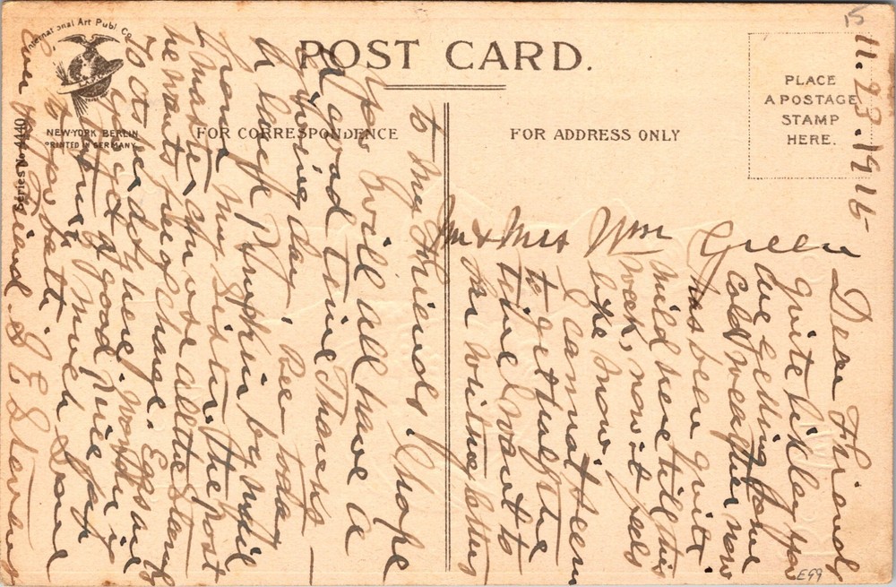 Delve into the spirit of Thanksgiving with this antique 1916 postcard featuring the cherished artwork of Ellen Clapsaddle. A sweet depiction of a young boy dressed like a Pilgrim carrying a fruit basket, this artist card captures the essence of the holiday with a touch of nostalgia. Published by the International Art Publishing Co., the card is a testament to the holiday's historical charm. This original piece, signed by Clapsaddle herself, is a treasure for collectors and enthusiasts of vintage art. It's a standard-sized card (5.5 x 3.5 in) with a divided back, made of quality paper, and proudly manufactured in Germany. Celebrate the season with this timeless greeting, unposted and awaiting a place in your collection.