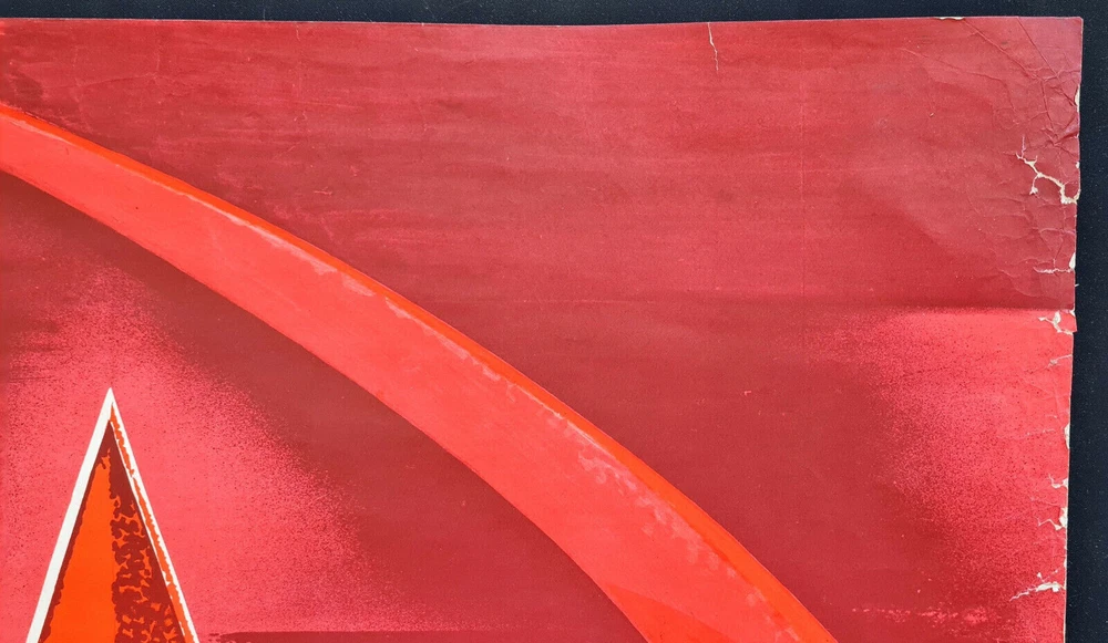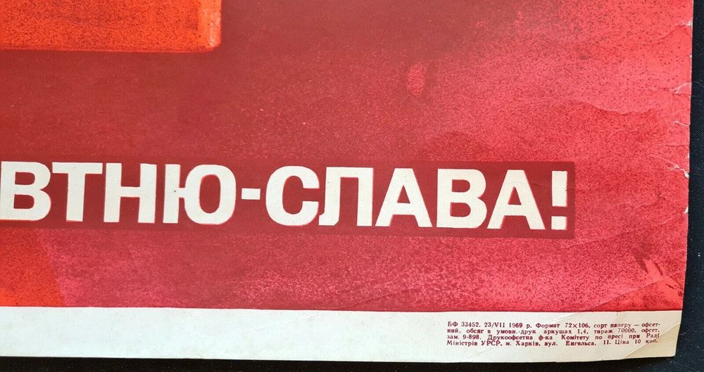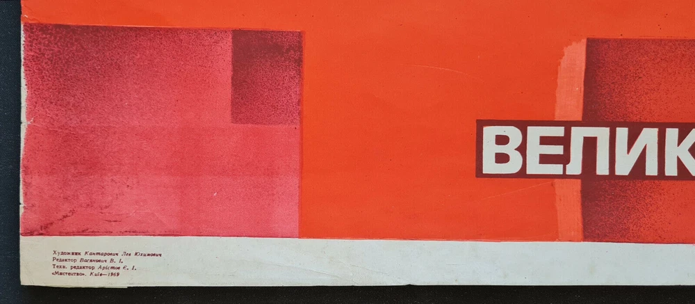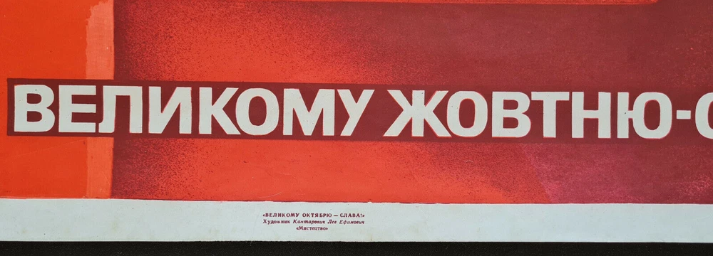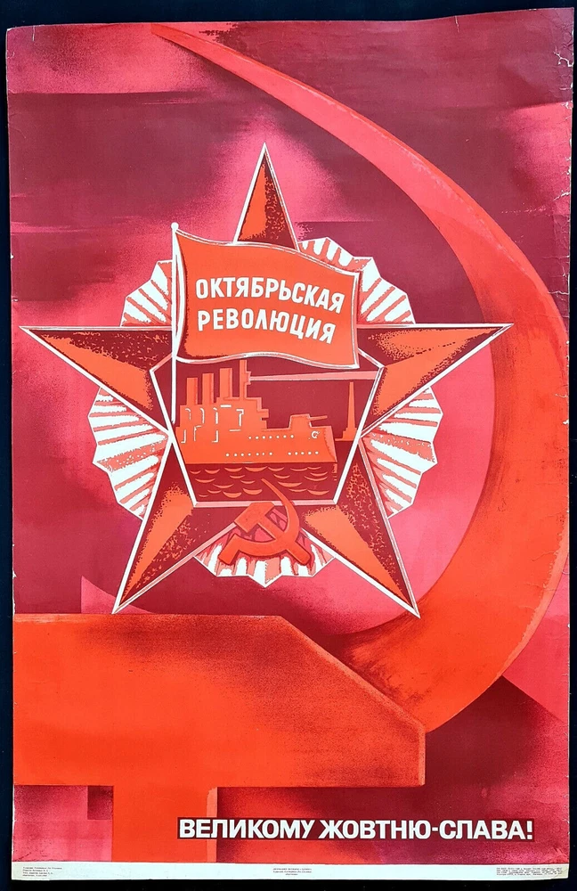- Original inscriptions on the poster: ВЕЛИКОМУ ЖОВТНЮ - СЛАВА! ОКТЯБРЬСКАЯ РЕВОЛЮЦИЯ Literally English translation: GREAT OCTOBER - GLORY! OCTOBER REVOLUTION border-spacing POSTER ARTIST: KONTAROVICH L.E. SUBJECT: RUSSIAN REVOLUTION PRINT YEAR: 1969 LANGUAGE: RUSSIAN PRINT RUN: 70.000 SIZE: IN: 27 ¼ x 41 ⅓ = CM: 69 x 105 PUBLISHED BY: "MYSTETSTVO", KIEV CONDITION: ROLLED, FROM FAIR TO GOOD VERY IMPRESSIVE ORIGINAL SOVIET RUSSIAN LARGE FORMAT PROPAGANDA POSTER, THERE IS (TAPE REPAIRED) CREASING ALONG RIGHT BORDER EDGE, OTHERWISE THE ARTWORK IS IN GOOD OVERALL CONDITION. BEFORE YOUR BID PLEASE CONSIDER THE POSTER CONDITION, IF YOU NEED SOME ADDITIONAL INFORMATION PLEASE FEEL FREE TO REQUIRE MORE PICTURES, IT WILL BE MY PLEASURE TO ASSIST YOU WITH ANY QUESTIONS REGARDING ANY AUCTION AT MY EBAY STORE. SHIPPING ROLLED IN A TUBE. The poster depicts the Order of the October Revolution that was instituted on October 31, 1967, in time for the 50th anniversary of the October Revolution. It was awarded to individuals or groups for services furthering communism or the state, or in enhancing the defenses of the Soviet Union, military and civil. It is second highest Soviet orders, after the Order of Lenin. - - - Listing and template services provided by inkFrog