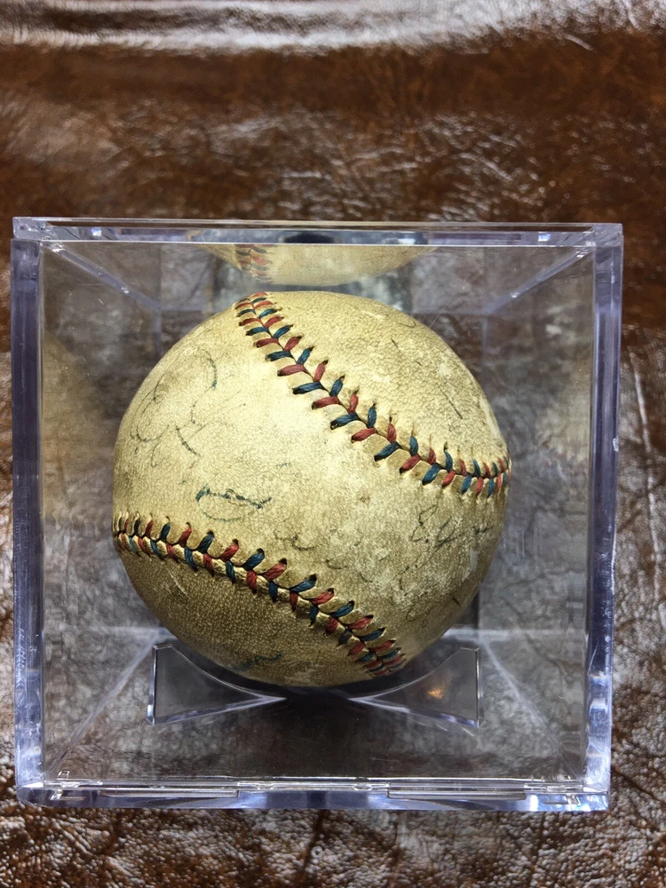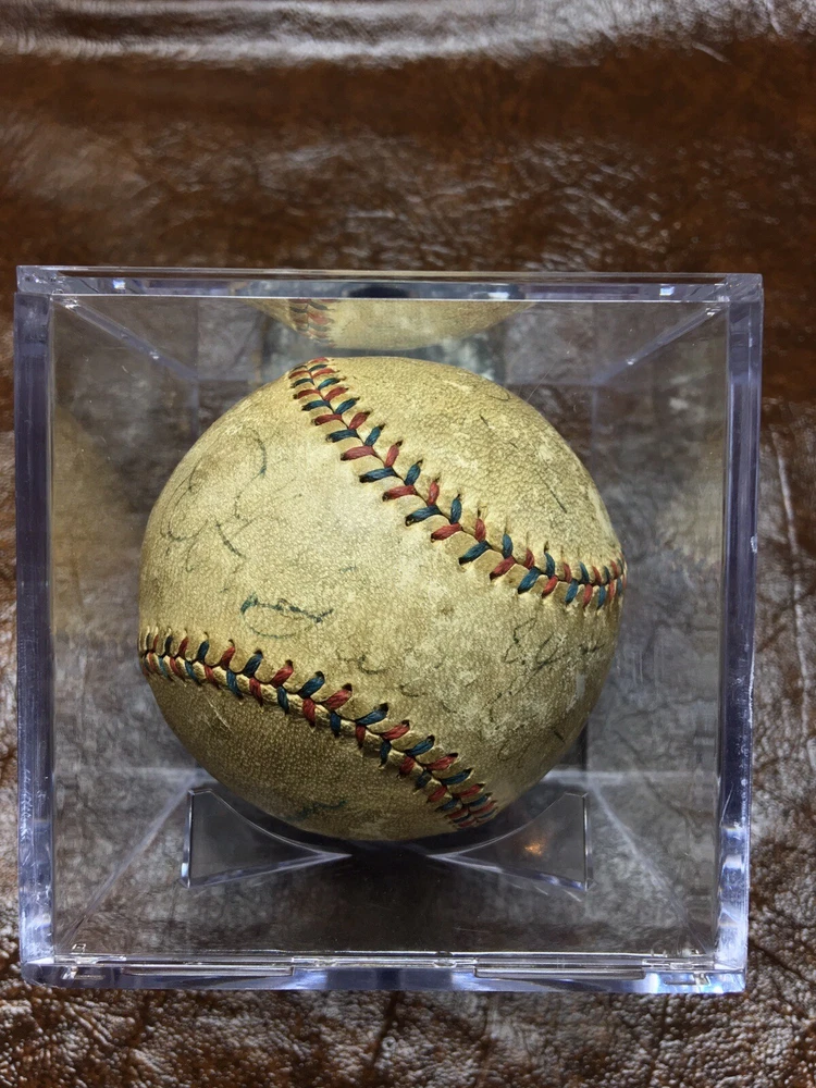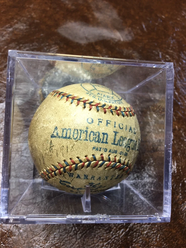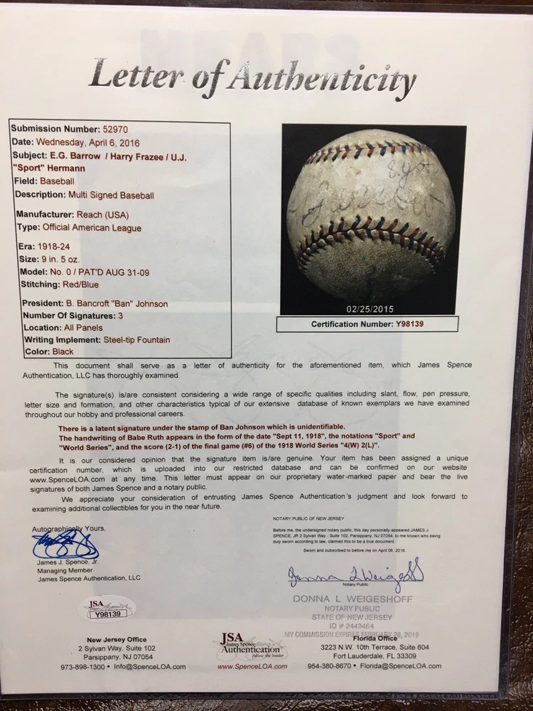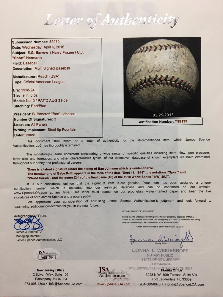 The only ball of its kind. This ball was used in the 1918 World Series Game 6 of Red Sox vs Chicago Cubs heavily inscribed by Babe Ruth with his nickname “ Sport” at the time before he was known to be Babe Ruth. This ball was the last out of the 1918 World Series Game 6 and was Babe Ruth’s personal ball for his own collection which he got signed by Sox Manager Ed Barrow, Team Owner Harry Frazee and Treasurer U. J. Herman. The name “Sport” was his early nickname before he started hitting home runs. Most historical ball ever used in Red Sox history as this was the last ball that they played with before they had the 86-year curse without winning any game after the team owner sold Babe Ruth to the Yankees.