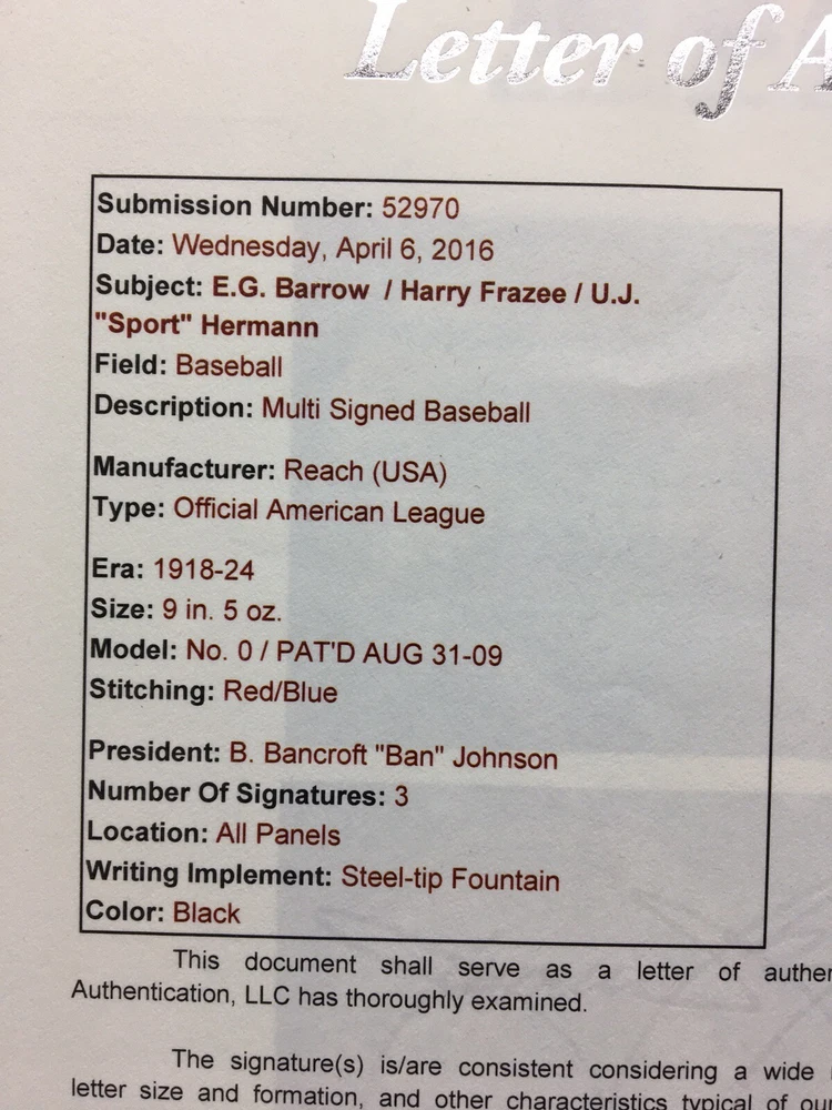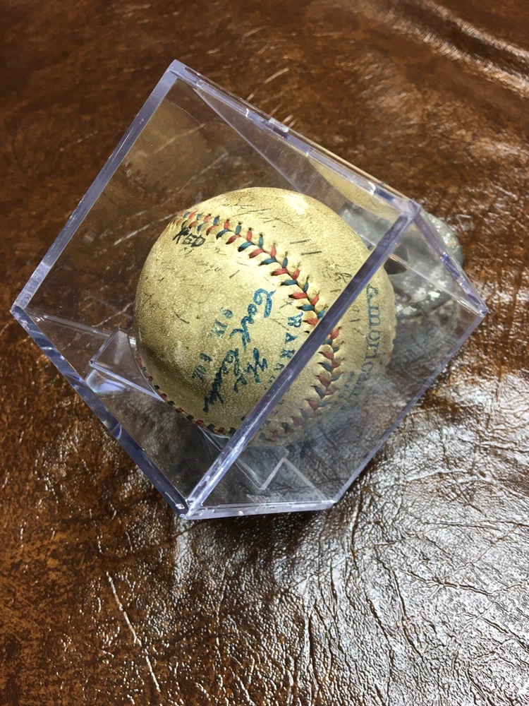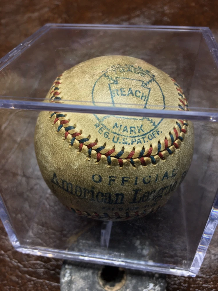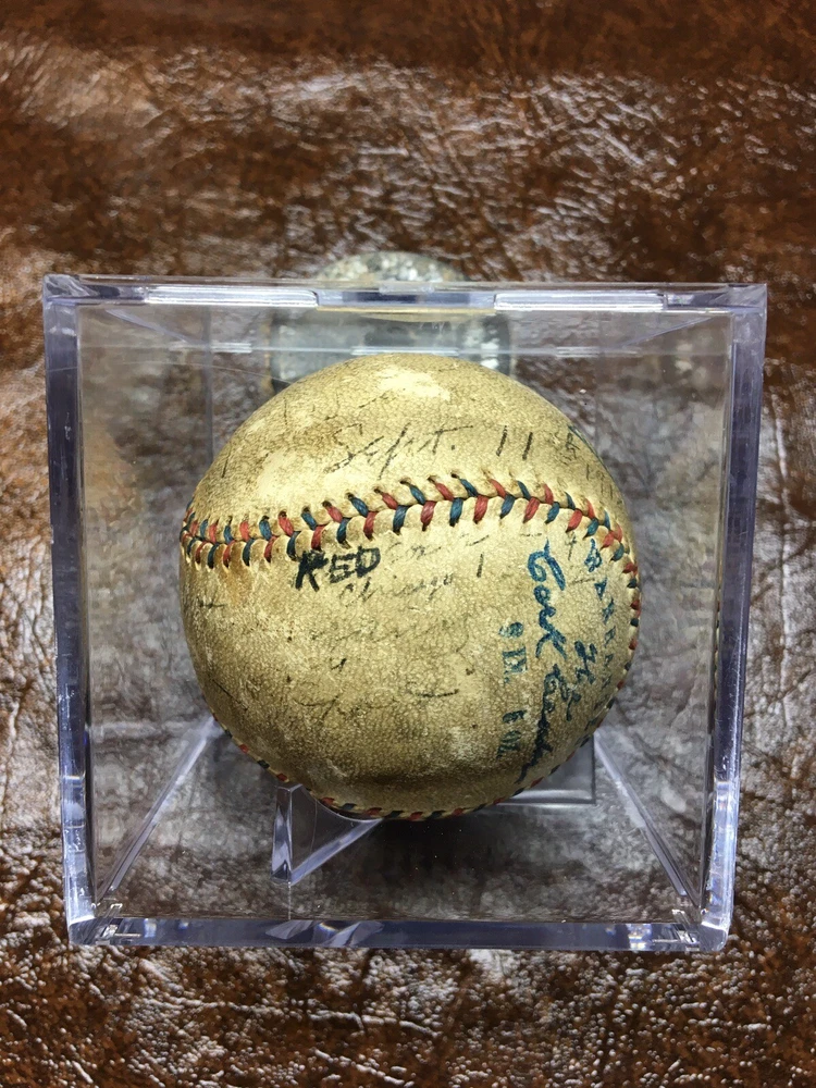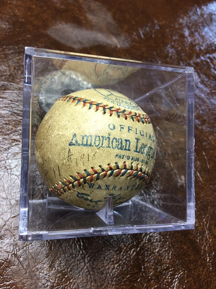 The only ball of its kind. This ball was used in the 1918 World Series Game 6 of Red Sox vs Chicago Cubs heavily inscribed by Babe Ruth with his nickname “ Sport” at the time before he was known to be Babe Ruth. This ball was the last out of the 1918 World Series Game 6 and was Babe Ruth’s personal ball for his own collection which he got signed by Sox Manager Ed Barrow, Team Owner Harry Frazee and Treasurer U. J. Herman. The name “Sport” was his early nickname before he started hitting home runs. Most historical ball ever used in Red Sox history as this was the last ball that they played with before they had the 86-year curse without winning any game after the team owner sold Babe Ruth to the Yankees.
