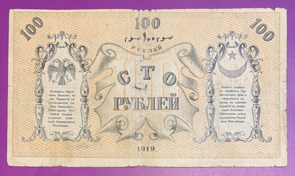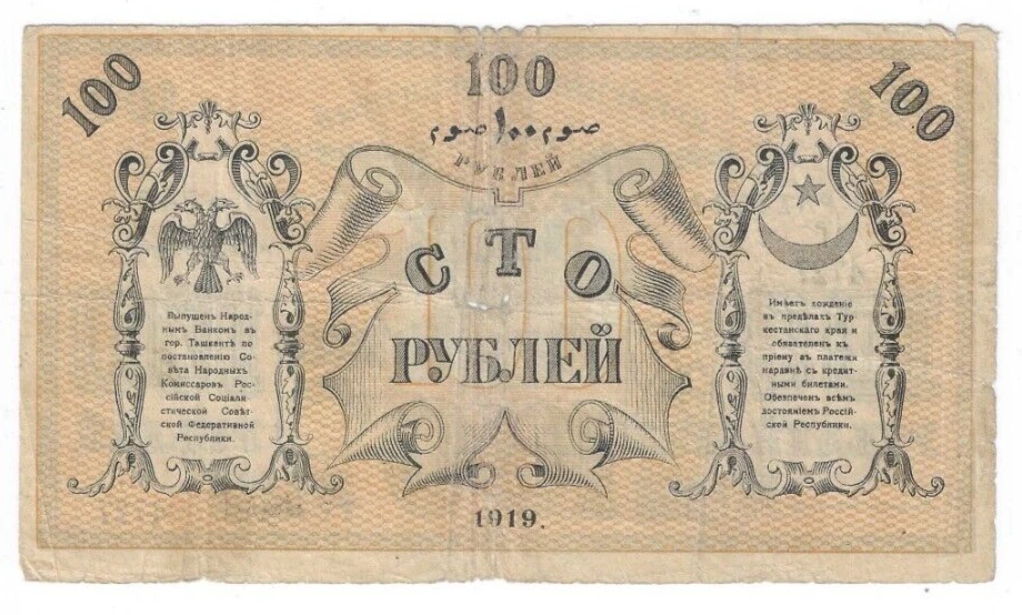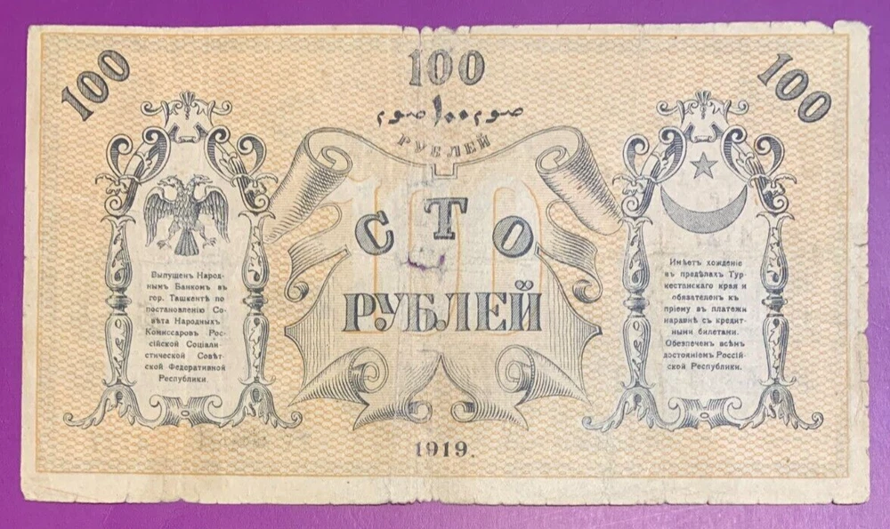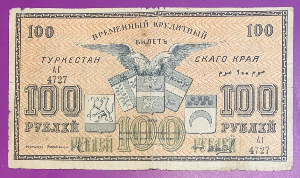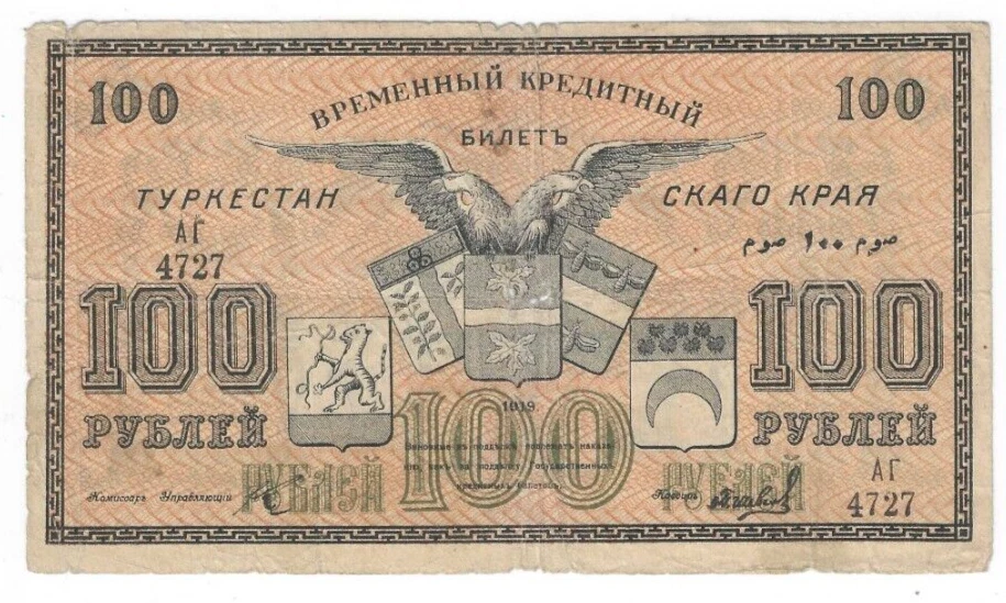 1919 100 rubles Civil war Russia Turkestan District lot # 40