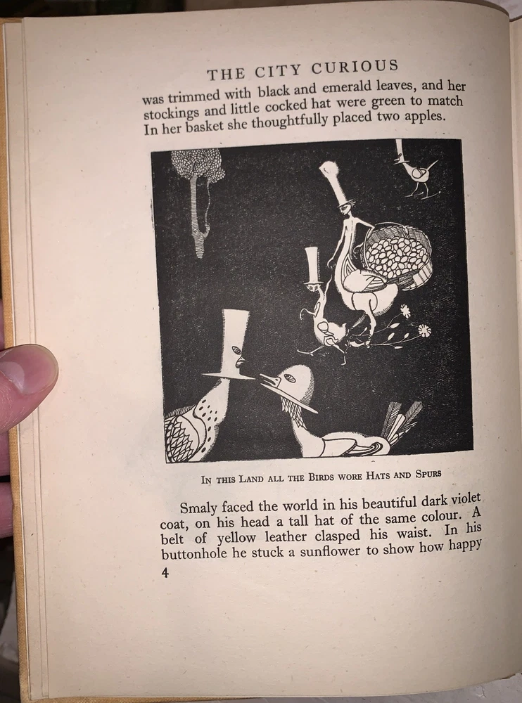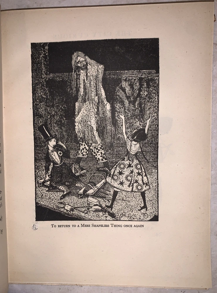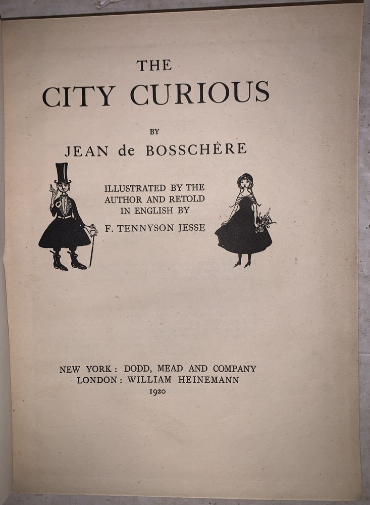 The City Curious by Jean de Bosschere Illustrated by the Author and Retold in English by F. Tennyson Jesse New York: Dodd, Mead and Company 1920 First Edition Small quarto, xii, 179 pages, publisher's original yellow cloth covered boards with pictorial decoration. Pictorial endpapers, illustrated throughout in black-and-white and with color plates. Now in a protective clear mylar jacket. Very minimal rubbing, else in very good + condition. The City Curious by Jean de Bosschere is a richly imaginative and symbolist work that blends prose, visual art, and philosophical reverie into a singular, dreamlike meditation on urban life. Rather than offering a conventional narrative, the book presents the city as a living, sentient presence—at once seductive, grotesque, and spiritually charged—filtered through de Bosschere’s distinctive blend of mysticism, eroticism, and psychological insight. Closely aligned with early 20th-century Symbolist and Decadent aesthetics, the work reflects the author’s fascination with the inner life, moral ambiguity, and the occult dimensions of modern existence. Today, The City Curious is valued as much for its intellectual and artistic ambition as for its place within the broader modernist and symbolist tradition, appealing especially to collectors of illustrated books and avant-garde literature. If you have any questions, feel free to ask, and don't forget to check out my other listings.