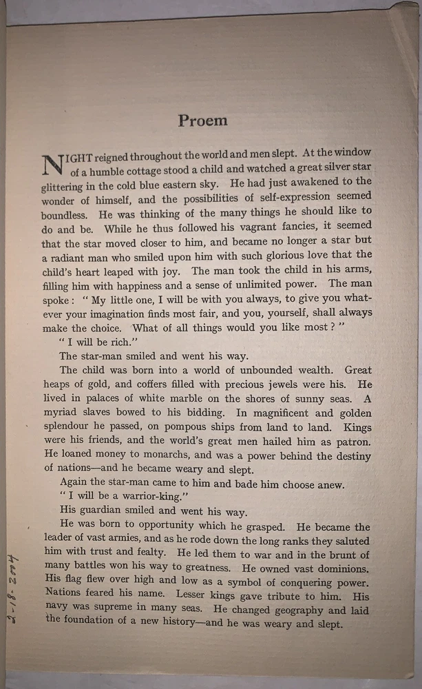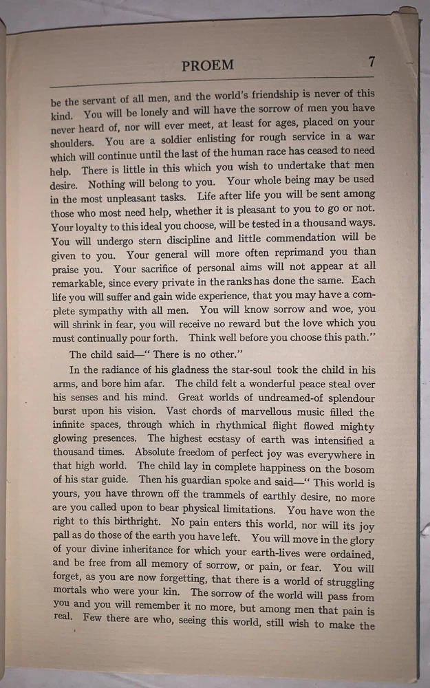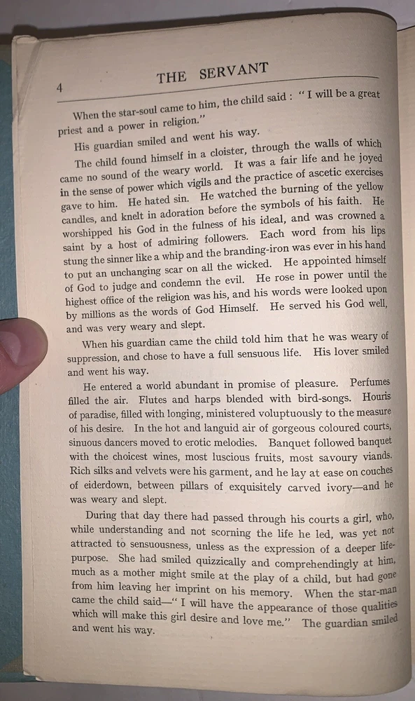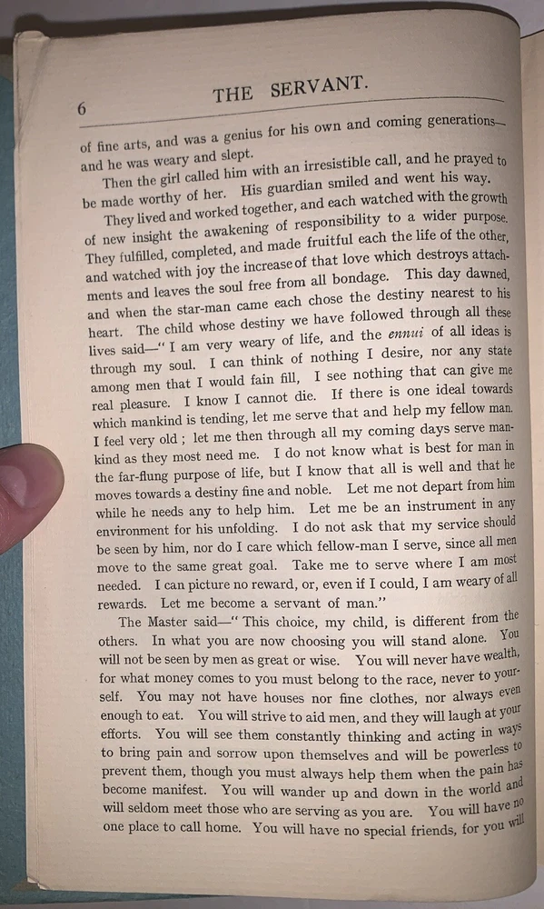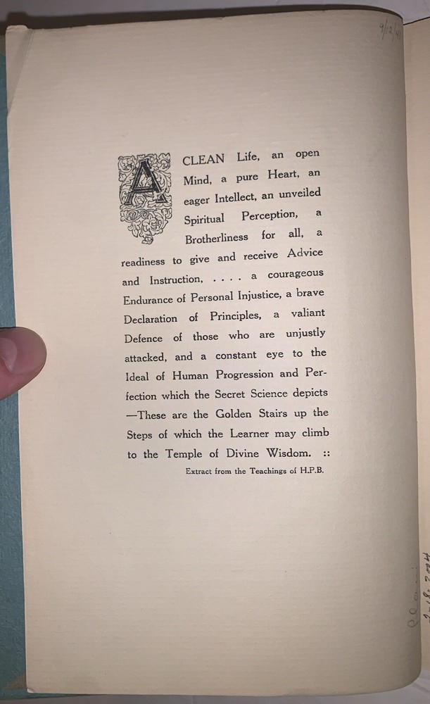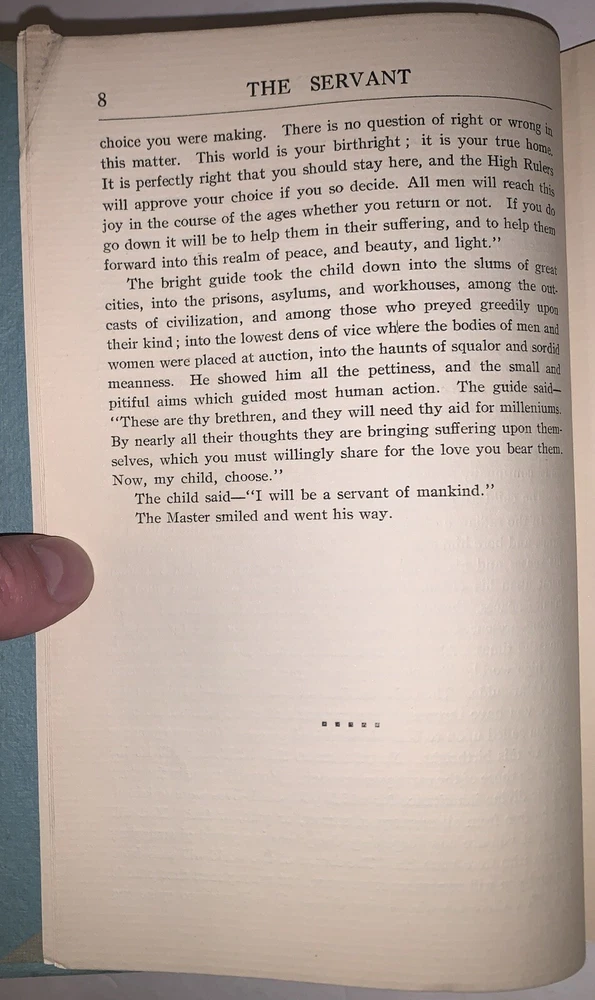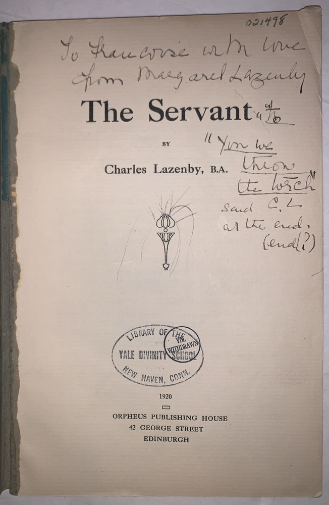 The Servant by Charles Lazenby, B.A. Edinburgh: Orpheus Publishing House 1920 First Edition Inscribed by the author’s wife, Margaret Lazenby: “To Francoise with love from Margaret Lazenby & ‘Yes, we throw the torch,’ said C. L. at the end (end?).” Octavo, 48 pages, publisher's original blue wraps. In the rear is the separate booklet "Shamballa and a Dedication - Three Vows Being the Epilogue to "The Servant" that boolet is 8 pages long. On the inside of the top wrap is the bookplate of Havelock Ellis. Some institutional ownership marks to the title. Front hinge cracked, some discoloration to wraps and a few pages, else in very good condition. The Servant by Charles Lazenby is a deeply reflective theosophical work that explores the path of spiritual dedication and selfless service. Written in a meditative, almost devotional style, the book presents the ideal of the aspirant who becomes a willing instrument of the divine will—what Lazenby calls "the servant." Drawing upon Theosophical teachings, it emphasizes humility, inner stillness, and alignment with higher purpose as essential qualities for those seeking to assist in the spiritual evolution of humanity. First published in 1920 and later reissued as a memorial edition in 1930 after Lazenby’s death, The Servant continues to resonate with readers interested in mystical philosophy, esoteric Christianity, and the inner life of discipleship.