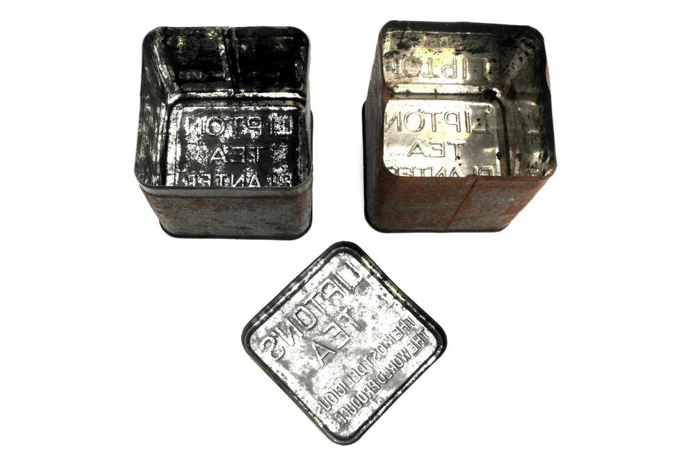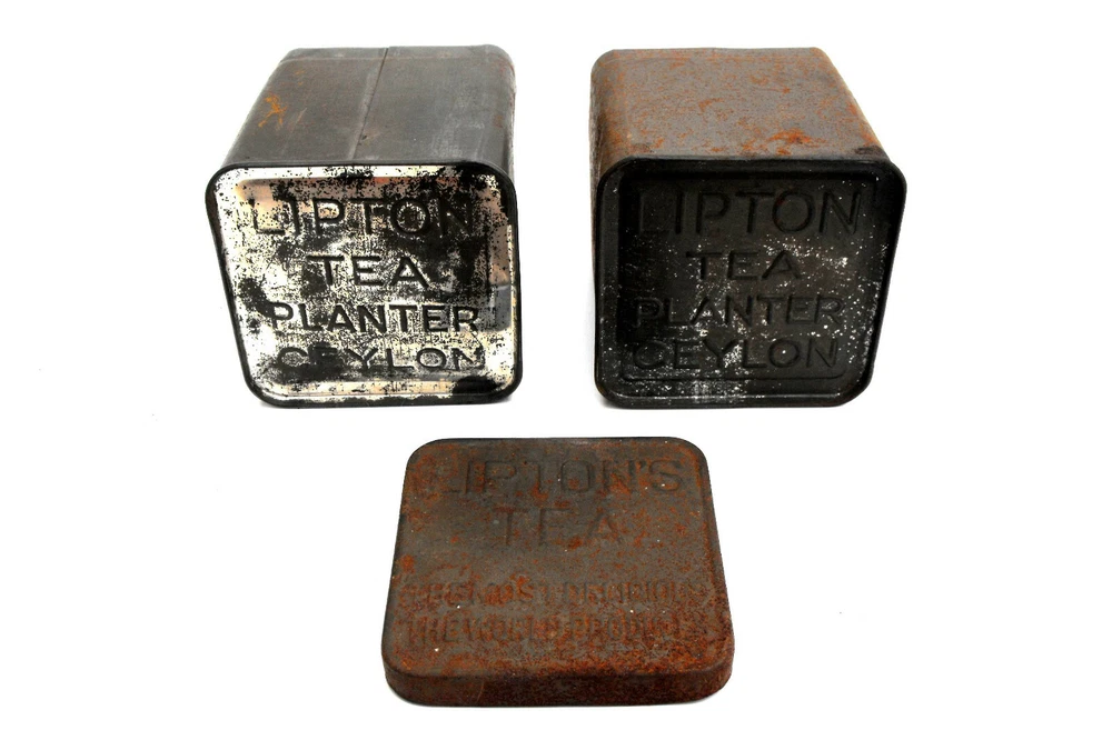 1920s Lipton Tea Tins Antique Teaware Ceylon Tisane Collectible Metal Tin Set 2 Container Storage Box Lid Rustic Distressed Farmhouse Decor Recovered from an old family home on Keystone Lake in Cleveland, Oklahoma, this antique original 1920s set of two Lipton Tea tins came from the kitchen of my great-great-grandmother Cecelia Hesson. One of the jars is missing it's lid. They are in a beautifully distressed condition, making them an excellent decor piece for a vintage inspired coffee shop. Her history and photo can be seen in the last photo here. My dear, late great-grandmother was her youngest daughter "Mary Catherine"; her mother's old tea tins had been treasured in her home for many years. I imagine these metal tea boxes were once used as storage containers for the tea bags used in our old Hesson family recipe for "Tea Syrup"; the recipe from our family cookbook is as follows... Hesson Family Tea Syrup: 4 qts. water 1/4 t. baking soda 5 gal. size tea bags Bring water to boil; steep tea bags in boiling water for 5 minutes. Remove tea bags and add baking soda. Let cool; put in gallon jugs. Makes strong tea. To serve: 8 c. water to 1 cup tea syrup. This will serve a large crowd and can be made ahead of time and refrigerated. Measurements: 3" wide x 3" tall