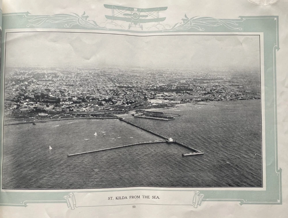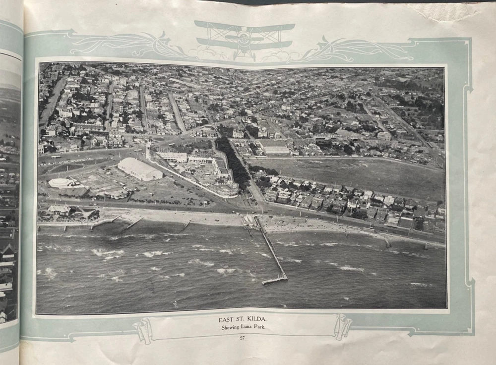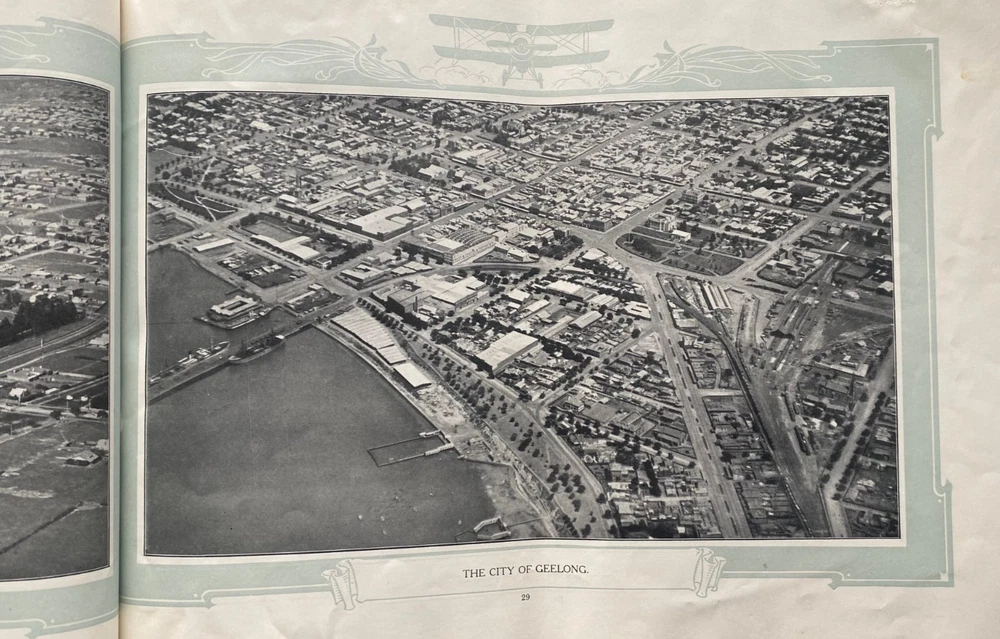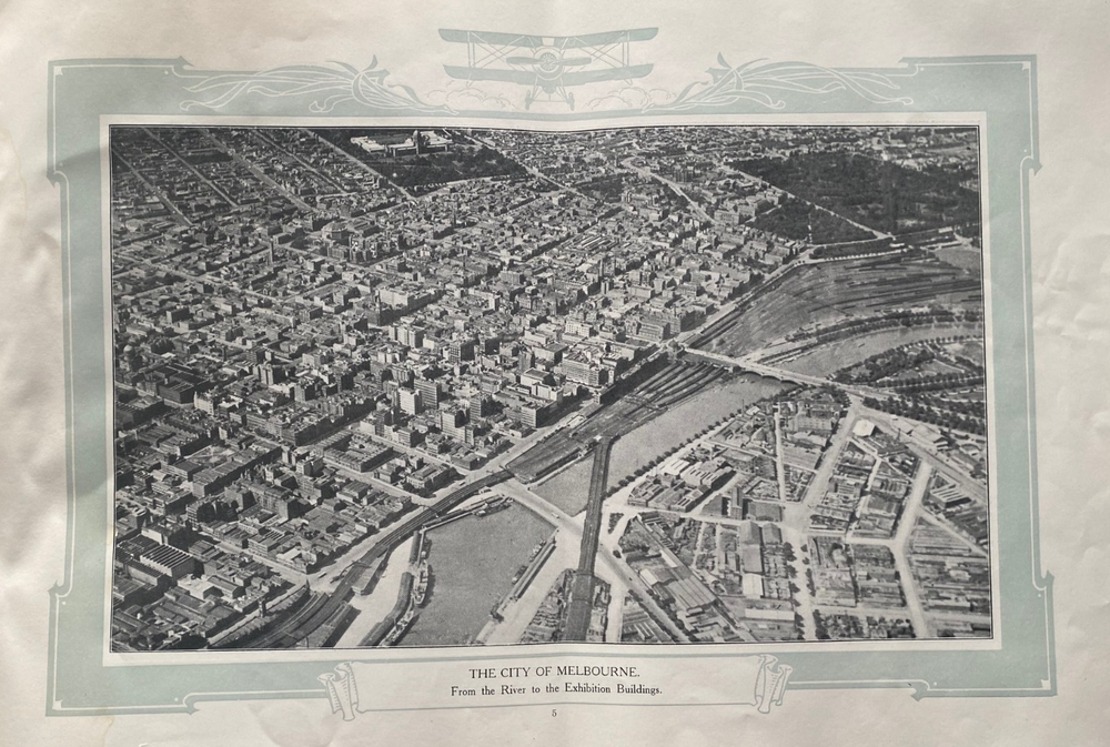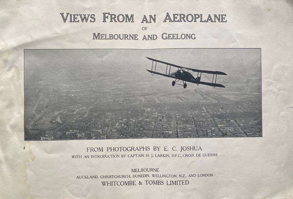 Express Shipping Worldwide is Free Views From an Aeroplane of Melbourne and Geelong Photographed by E. C. Joshua Introduction by: Captain H. J. Larkin (DFC, Croix de Guerre) Published by Whitcombe & Tombs, Melbourne, 1921 First Edition A very rare volume With 27 full page photographs from over 100 years ago: The city of Melbourne South Melbourne North Melbourne Collingwood and Fitzroy Albert Park Wool and Wheat Stores, Kensington Some Great Factories in Yarraville Carlton Wesley College, Melbourne St. Francis Xavier College, Kew Church of England Grammar School, and Botanical Gardens, Melbourne A Football Final on the Melbourne Cricket Ground Finish of the Public Schools' Boat Race, Geelong, 1921 The Maribyrnong River Camberwell Toorak Asylum for the Insane, Kew New Scotch College, Glenferrie St. Kilda from the sea Murrumneena The Yarra at Richmond Box Hill East St. Kilda Preston The City of Geelong Geelong Grammar School The Foreshore, Geelong Historical context This book was produced at a very specific moment: 1. Early civil aviation period 1921 is just after World War I, when aviation technology became publicly accessible. Aerial photography was still novel and technically difficult — making publications like this unusual and prestigious. 2. Australia’s first aerial city imagery It represents some of the earliest systematic aerial views of Melbourne and Geelong. Prior to this, most urban imagery was ground-based or from elevated viewpoints (towers, hills). This makes the book an important visual record of urban form before modern development. Photographic plates The book consists of a sequence of aerial photographs taken from an aircraft. Each plate is mounted within a decorative printed frame, and captioned with the location. In oblong format with pictorial covers in 32 pages with some 27 full page views. There is shelfwear, creasing, a trace of foxing to the front cover. There are old moisture marks affecting the covers, the first three leaves, and the last leaf, but does not affect the text or the plates. There is the odd tear that does not affect the text or plates. The stapled binding is solid. There are no missing or loose pages. Complete and original. Measures 37.5cm x 25cm. EXPRESS SHIPPING AND HANDLING is Free Worldwide All items are securely and well packed. Thank you for viewing my item.