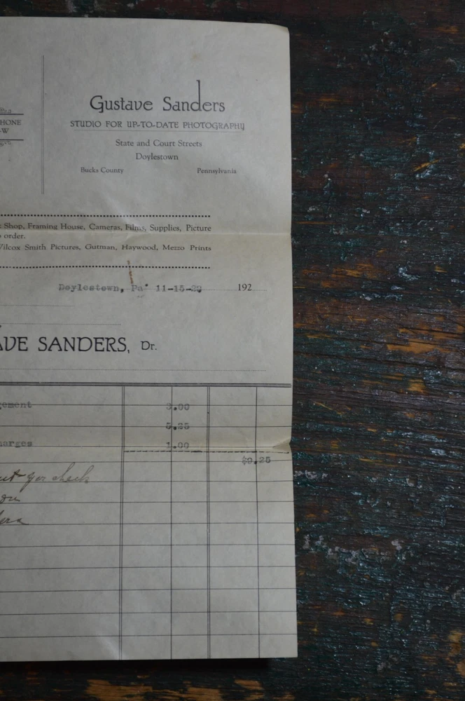 Description:1922 Gustave Sanders Signed Doylestown PA Bucks County Photo Studio Billhead. Bill addressed to Judge William C. Ryan of Doylestown, PA. Seller notes folds and some discoloration. Still, exceedingly scarce item with photographer's signature. Studio billhead also advertises Wallace Nutting and Maxfield Parrish "Masterpieces." Would look great framed in a local photographic studio. Questions and offers welcome. Please review entire listing (including condition, title, pictures, description, and terms) before committing to purchase this listing. Before agreeing to purchase this listing, make your own determination on condition of the item(s) being offered in this listing. Pictures are part of the description and are provided to help illustrate condition. Since descriptions and opinions of condition can vary, seller provides prospective buyers with the ability to request more information and additional pictures before the close of this listing. When in doubt, please contact Taggart Neveling Books Ephemera, LLC "the seller" through eBay before you bid or agree to purchase this listing. This helps ensure a smooth transaction, one where Taggart Neveling Books Ephemera, LLC gets a sale and the buyer gets the item(s) they want to purchase. Condition & Disclosure of All Faults: All items appearing in this listing are pre-owned and are sold "AS-IS" and "WITH ALL FAULTS." No warranties, express or implied, are made in connection with this listing. Additionally, all other warranties not specifically listed above, are also disclaimed. Since the seller, Taggart Neveling Books Ephemera, LLC, does not provide any warranties with this listing, to the fullest extent allowed by law no sale shall be deemed invalid. A written description and uploaded pictures are offered to help provide a general idea of condition. Pictures are part of the description, but may not show every defect or flaw of an item or collection of items. The written description offered in this listing may not state every single defect or flaw in condition associated with item or items offered in this listing. However, Taggart Neveling Books Ephemera, LLC "the seller" offers potential buyers the ability to submit questions before agreeing to purchase this listing. Buyer agrees that a failure to exercise this option is not sufficient cause to initiate a return. Since Taggart Neveling Books Ephemera, LLC offers potential buyers the ability to submit questions before agreeing to purchase this listing, by bidding or agreeing to purchase this listing, buyer agrees seller has provided sufficient legal disclosure of all defects and faults, even if such defects and faults are not specifically identified in the written description or shown in the uploaded images. All statements and descriptions about age, authenticity, condition, fitness for a particular purpose, or origin of items offered in this listing, as well as those made in response to questions about this listing, reflect the opinion of the seller and are NOT offered as statements of fact. By bidding or agreeing to purchase this listing, the buyer agrees that to the fullest extent allowed by applicable law, Taggart Neveling Books Ephemera, LLC "the seller" will not be liable for any defect, error, or omission in this listing. By bidding or agreeing to purchase this listing buyer agrees to have performed all due diligence beforehand. By bidding or agreeing to purchase this listing buyer agrees all items offered in this listing may require cleaning, conservation, or repair. By bidding or agreeing to purchase this listing, buyer agrees ALL SALES ARE FINAL. NO REFUNDS. NO PARTIAL REFUNDS. NO RETURNS. NO EXCHANGES. Digital Photos and on Screen Viewing: Cameras and computers sometimes display colors differently. Colors, when viewed on a computer screen, can be lighter or darker than the actual item(s) that is being photographed. Please keep this in mind when you place your bid. Please also note: No display props or materials (tape measures, stands, or other items that may be used to help display a listing) are included. Taggart Neveling Books Ephemera, LLC welcomes questions, but asks all potential buyers to submit questions at least one day before the close of this listing. This helps ensure there will be enough time to respond to questions before the close of the listing. Payment Policy: Payment is due within two days of the close of a listing. If a listing remains unpaid for three or more days the issue will be reported to eBay. Failure to pay for an item in a timely fashion may result in a buyer being blocked from both current and future listings offered under this user ID. Sales Tax, Use Tax, Other Taxes: Since tax laws vary by state, you may be responsible for remitting sales or use tax to the appropriate state agency. The bidder, by bidding, agrees that if any sales or use tax (or any other tax) is due on the item(s) purchased, it is to be paid and remitted to the appropriate agency by the buyer and not the seller. Please note that eBay has largely automated this process. However, if there is any error in eBay's collection or the calculation of tax due, the buyer agrees, to the fullest extent allowed by law, to pay the correct amount to the appropriate agency and to not hold the seller responsible for covering any additional amount of tax due. Shipping Policy: Shipping Cost for this listing (Within Continental US): Item will ship for $4.95, with tracking, to continental US. Please note: No in-person pickups or deliveries are offered with this listing. Delivery for this listing will only be made via USPS mail. In listings without free shipping offered, total shipping cost includes all aspects of shipping, such as packing materials, time to pack the listing(s), time and expense incurred to get the listing(s) to the post office, and lastly postage. Postage is just one aspect of shipping cost. Please keep this in mind if you happen to see an instance where the shipping cost charged 
