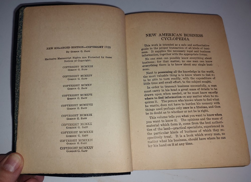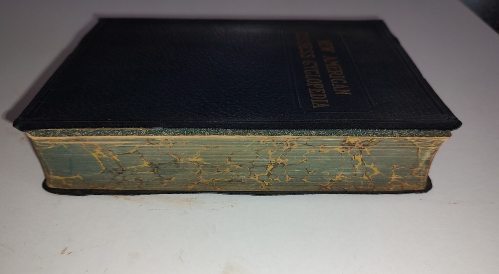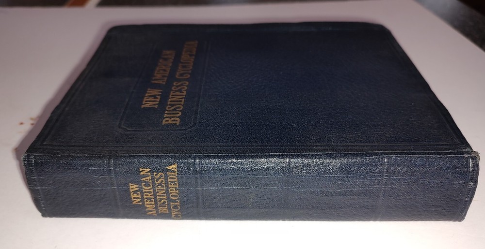 New American Business Cyclopedia By E. T. Roe, 1926 Edition, Dark Blue Leather. This is a book on running a business in the early 20's. It's in very good condition for it's age. No writing in book. Complete. No rips or torn pages. Some browning on edges of paper. Not at the point of crumbling.