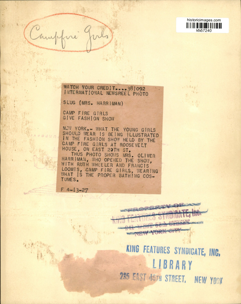 ebay template Note: Please study the images carefully to determine the condition of this vintage photograph, as it may not be in perfect condition. It may contain wrinkles, cracks, and possibly even tears due to its age and how it was handled before it got to us. A scanner may interpret colors and contrast differently than human eyes will, so it is possible that the actual photograph may be slightly darker or lighter in person. This vintage photograph is offered for sale as a collectible item and conveys no transfer of copyright. 1927 Press Photo Mrs. Oliver Harriman & Camp Fire girls at New York fashion show This is an original press photo. New York - What the young girls should wear is being illustrated in the fashion show held by the Camp Fire Girls at Roosevelt House, on East 20th St. This photo shows Mrs. Oliver Harriman, who opened the show, with Ruth Wheeler and Francis Loomis, Camp Fire Girls, wearing what are the proper bathing costumes. Photo measures 8 x 10inches. Photo is dated 04-13-1927. PHOTO FRONT PHOTO BACK Historic Images Part Number: kfx57240 Sell Smarter with Kyozou. Inventory and Ecommerce Management