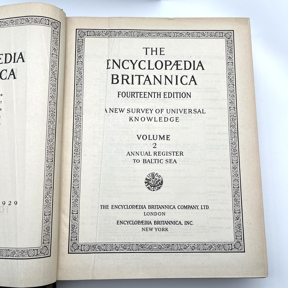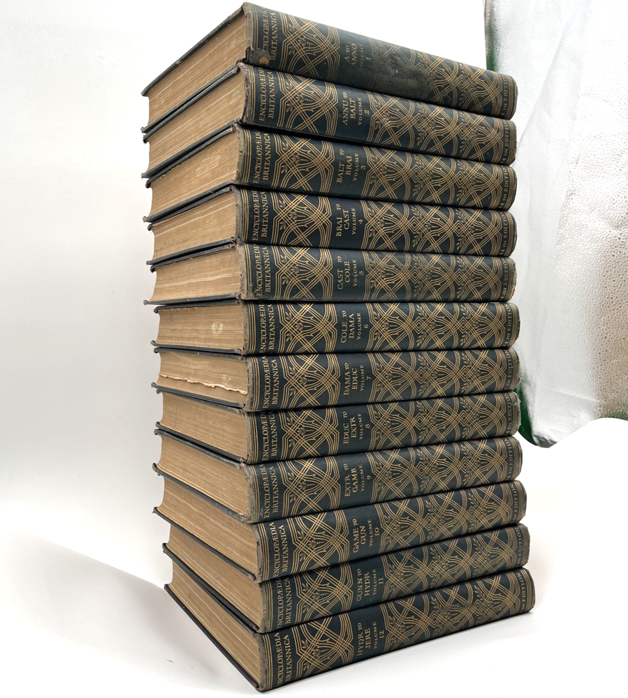 This is a partial set of the 14th Edition Encyclopaedia Britannica , published in 1929. It includes Volumes 1 through 12 (of a complete 24-volume set). These books are nearly 100 years old and offer a fascinating historical perspective on early 20th-century knowledge and scholarship. Publisher: Encyclopaedia Britannica, Inc. Edition: 14th, 1929 Volumes Included: 1 to 12 Language: English Binding: Hardcover Condition: Overall good antique condition. Pages are clean and legible. Some volumes may show signs of age such as scuffing, light foxing, and edge wear. A few pages are slightly damaged but remain readable. Covers show typical wear for books of this age. Note: This listing is for Volumes 1–12 only , not the complete set. A wonderful collector’s item, library addition, or vintage decor piece.
