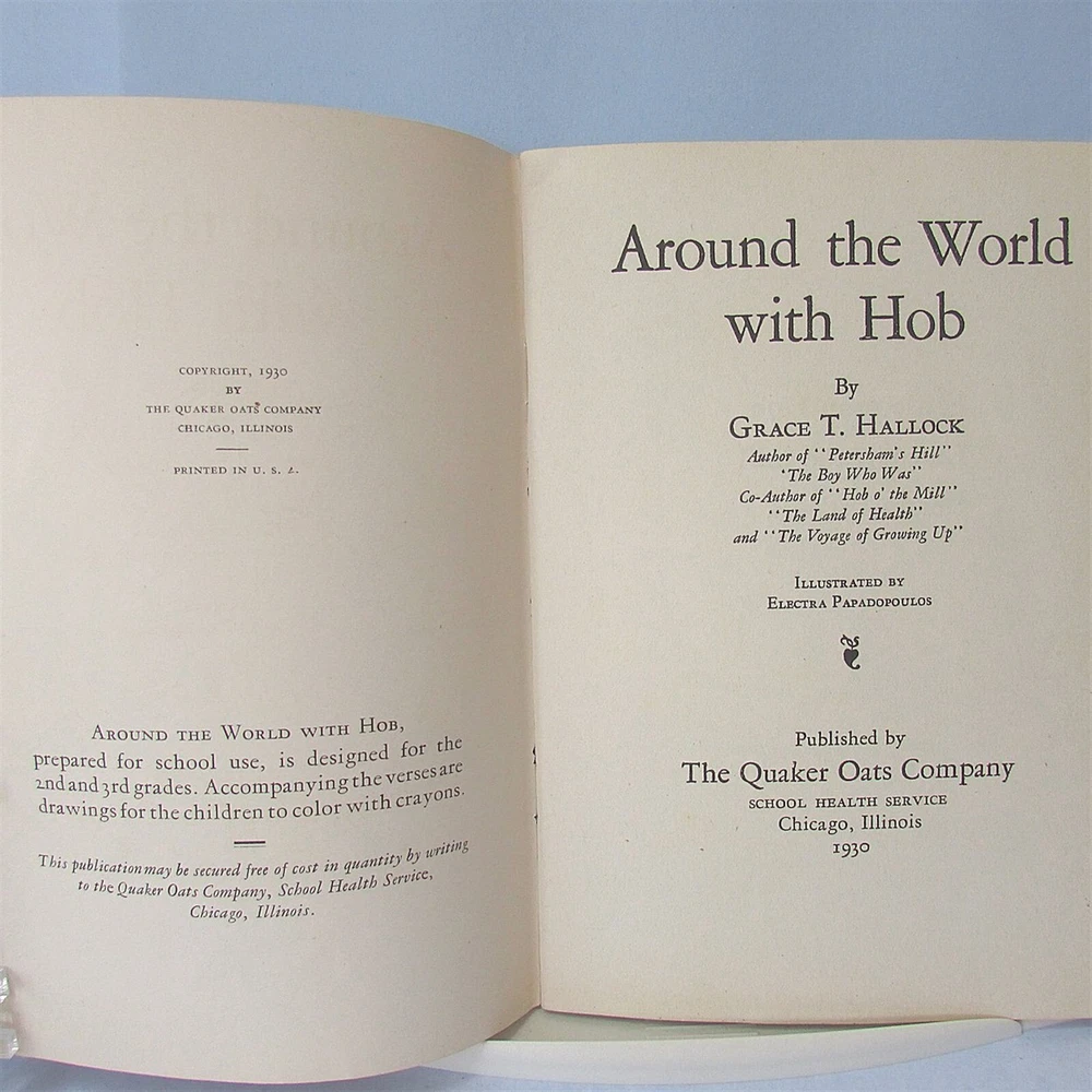 1930 QUAKER OATS Premium Children BOOK Around World HOB G Hallock Vintage Vintage The Quaker Oats Company Premium Children's Book, "Around the World with Hob" by Grace T. Hallock and Illustrated by Electra Papadopoulos. Copyright 1930. Book is prepared for school use, designed for 2nd and 3rd grade. Copies could be obtained free by writing to Quaker's School Health Service. 7 1/4" x 5 1/4". 44 pages. There are pictures to be colored inside and all but one is colored. Shows children of difference countries with their names. Softcover, nice condition, other than having been coloring inside. My listings will show up to 3 business days for shipping. This will actually only apply to any package that will not fit in my mailbox, these packages will be shipped 1-2 days. The 3 business days applies to packages that need to be picked up by the Post Office. Thank you for your patience. Satisfaction Guaranteed. Return in original Packaging within 30 days for full refund. Please notify me that an item is being returned. Powered by SixBit's eCommerce Solution