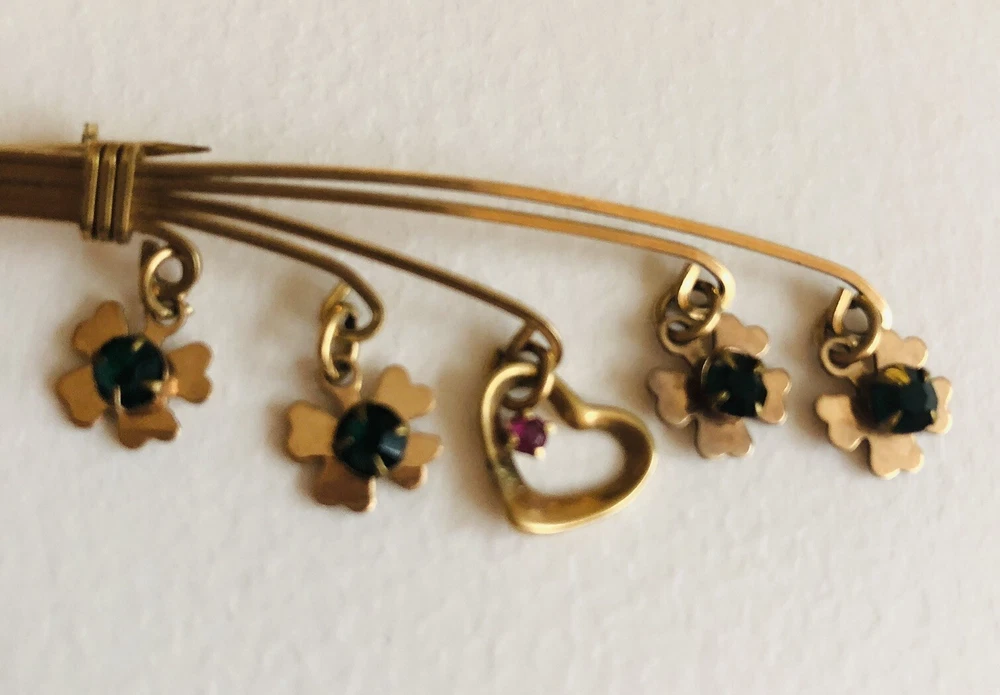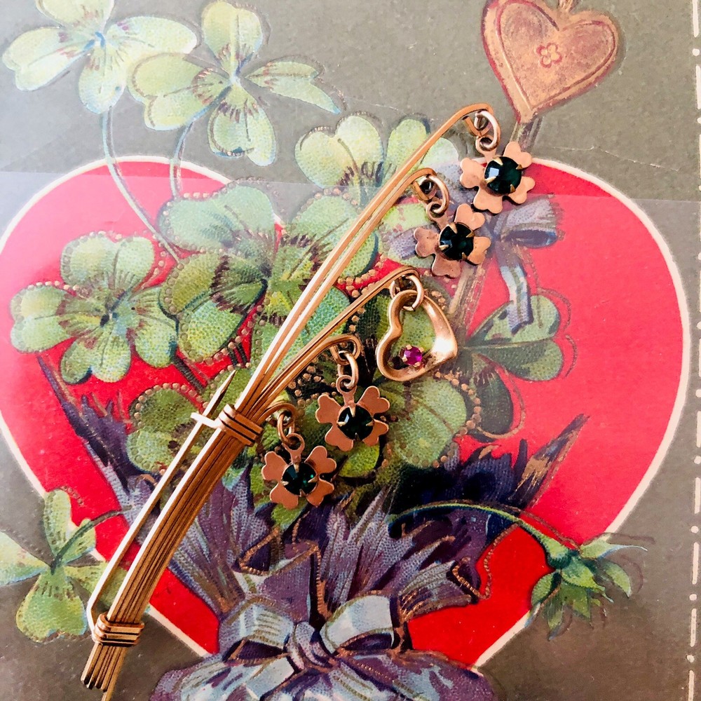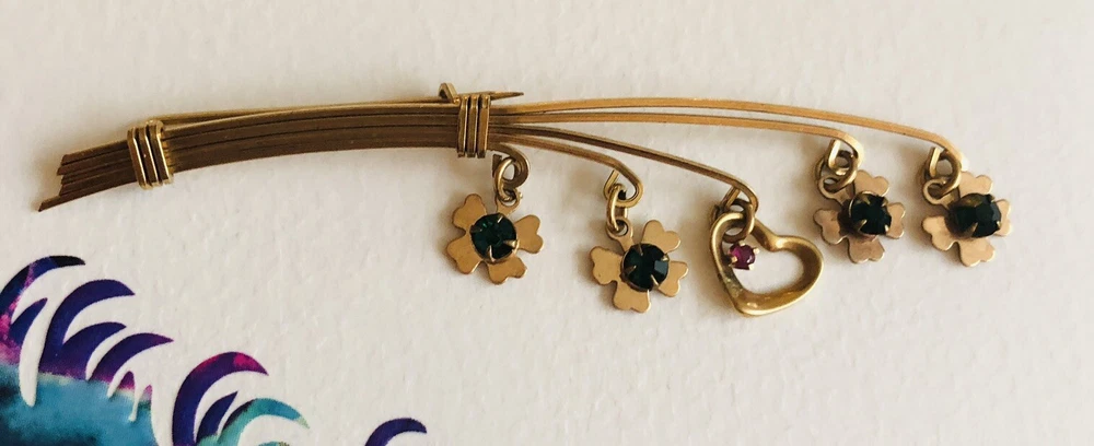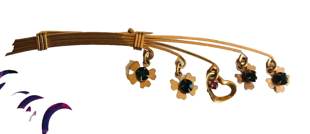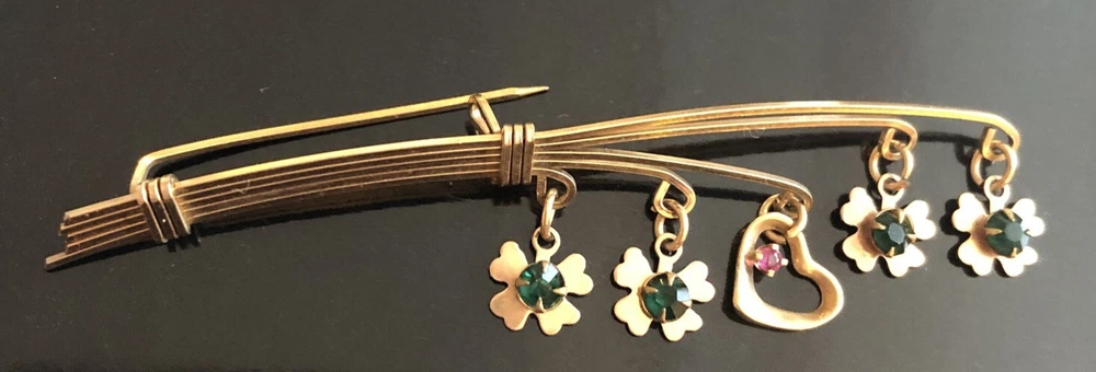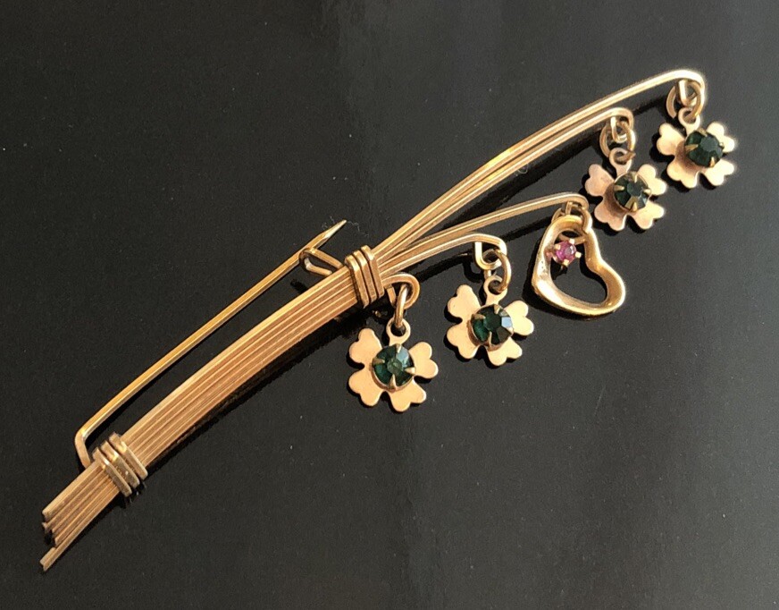 This Lucky 12k Gold Filled Brooch is a beautiful addition to any jewelry collection. The brooch features 4 clover shaped charms and a central heart charm. The unique design make it a perfect accessory for any vintage or antique jewelry enthusiast. The base metal is gold and The pin is in excellent condition and will make a great addition to any outfit. Brooch measures about 2.5 inches long EBA1-0002