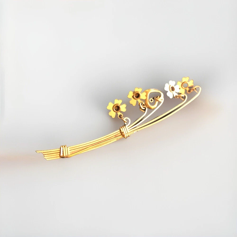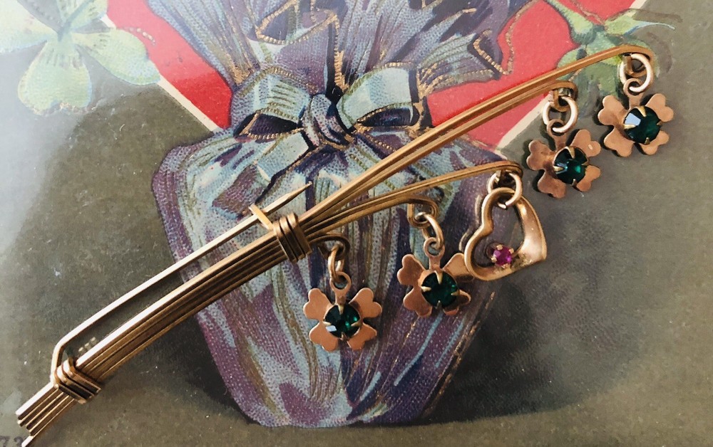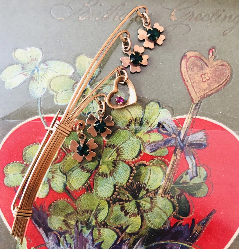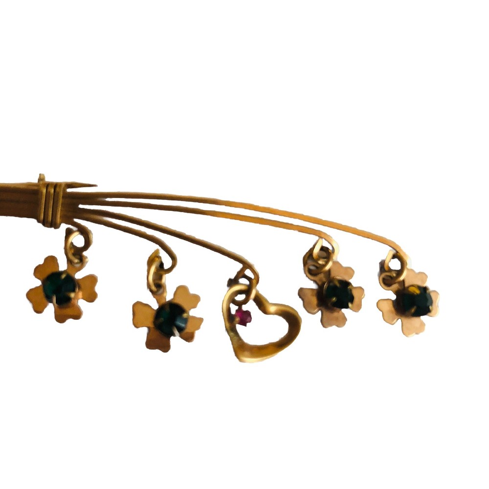 This Lucky 12k Gold Filled Brooch is a beautiful addition to any jewelry collection. The brooch features 4 clover shaped charms and a central heart charm. The unique design make it a perfect accessory for any vintage or antique jewelry enthusiast. The base metal is gold and The pin is in excellent condition and will make a great addition to any outfit. Brooch measures about 2.5 inches long EBA1-0002