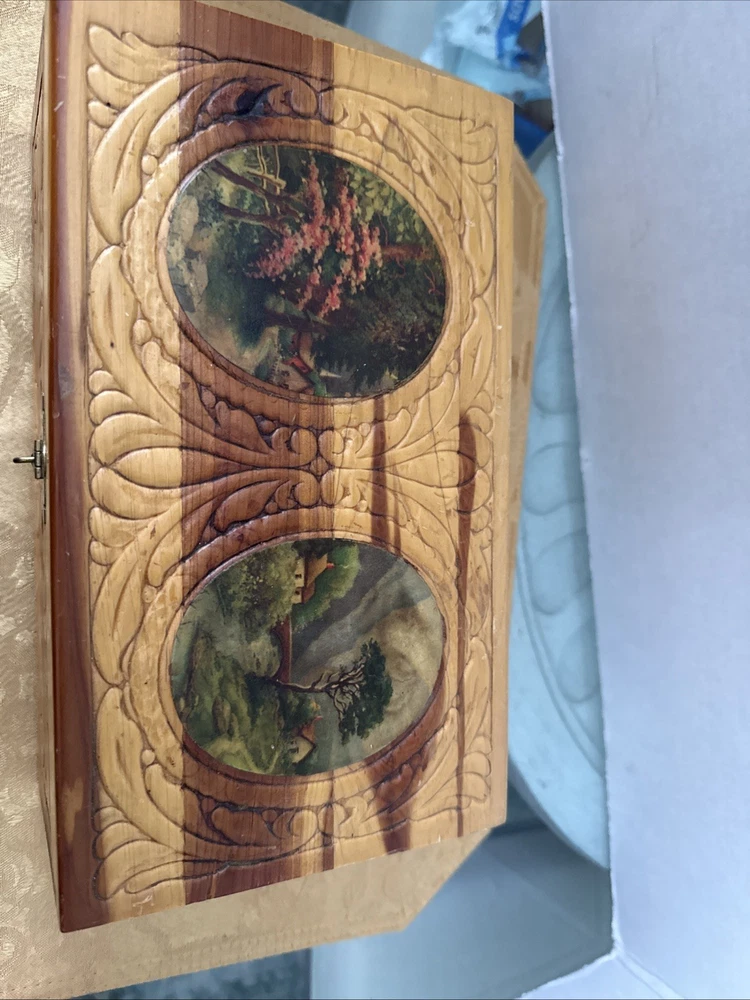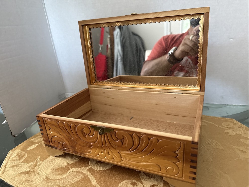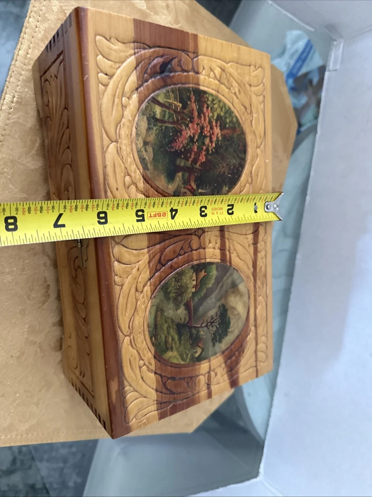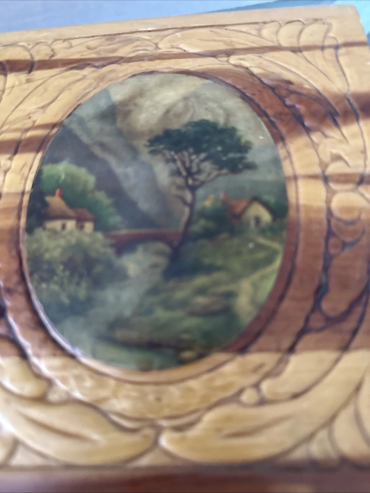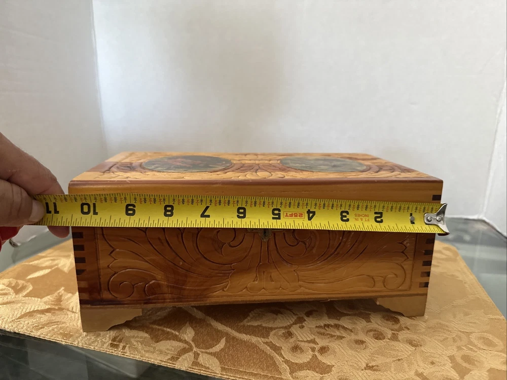This exquisite jewelry box from the 1930s is a stunning piece of art deco craftsmanship. The carved wood design features beautiful Italian river prints and a mirrored finish. With a size of 10.5 inches in length and 6 inches in width, this medium-sized box is perfect for storing your precious jewelry and keepsakes. The box is made of high-quality cedar and is adorned with a vintage brand label. It has a unique character of Lake Como and is suitable for all occasions. This collectible item is perfect for adults who appreciate the beauty and craftsmanship of vintage jewelry boxes. It is a must-have for those who love the art deco style and want to add a touch of elegance to their home decor. Look at the pictures before making your purchase