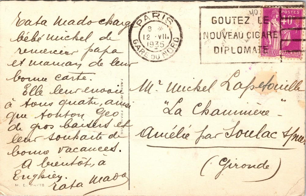 Charming 1930s French Walt Disney–authorized postcard featuring characters drawn in the unmistakable likeness of Mickey Mouse and Minnie Mouse in a sweet romantic “flowers for you” scene. This card was published in France and is fully marked on the back: “Éditions M. L. Paris – Par Autorisation: Walt Disney – Mickey Mouse S.A.” This confirms it as an authentic, licensed European Disney postcard — and an increasingly scarce one. 🎨 Front Image Details Mickey-style character, wearing classic red shorts , yellow gloves, and big shoes, presents a bouquet of roses with a gentlemanly flourish of his lavender top hat. Minnie-style character, in a blue skirt and yellow gloves , reacts joyfully and bashfully at her doorway. Soft pastel brickwork, charming street details, and the expressive faces give this card that distinct 1930s French Disney aesthetic. Caption reads: “Quelques fleurs pour vous, Madame !…” (“Some flowers for you, Madame!”) This artwork belongs to the beloved era of early European Disney licensing, where French illustrators rendered Mickey and Minnie in slightly stylized forms while keeping their unmistakable likeness. 📬 Back Details Postmarked Paris – Gare du Nord – 12 August 1935 . Two French 40c violet stamps (Type Semeuse). Beautiful handwritten French message. Printed on left: “Éditions M. L. Paris – Par autorisation: Walt Disney – Mickey Mouse S.A.” “Fabrication Française” down the center line. Full usage and period ink—all correct for mid-1930s French postcards. 📚 Historical Context In the early-to-mid 1930s, Disney licensed a small number of European publishers to produce region-specific Mickey Mouse ephemera. France embraced Mickey instantly, and postcards became one of the most popular formats. These postcards: were printed in small batches feature unique French artistic interpretations of Mickey & Minnie mix American character design with Parisian charm were sold in stationers, bookshops, and department stores are now much harder to find, especially postally used examples from the 1930s This card is also a wonderful snapshot of how Mickey Mouse imagery spread internationally just a few years after his 1928 debut. 📏 Postcard Details Authentic licensed Disney postcard 1935 Paris postmark Published by M. L. Paris Divided back Color lithograph Size approx. 3.5” × 5.5” 📝 Condition Mild corner/edge wear consistent with age Light age toning Front colors bright and clean Minor stains on reverse, not affecting image Beautifully preserved for an 88-year-old postcard 🎯 Ideal For Collectors Of Early Mickey & Minnie Mouse likeness items Disney ephemera (1930s) French Disney postcards Valentine / romantic-themed Disney art Vintage Paris mail Pre-war animation collectibles