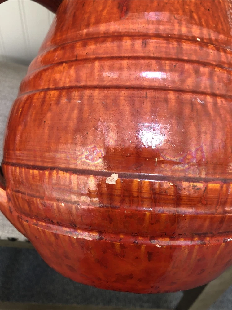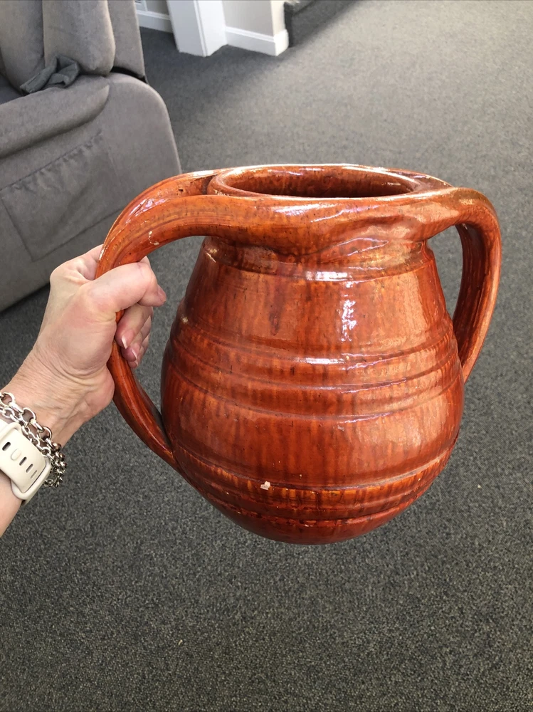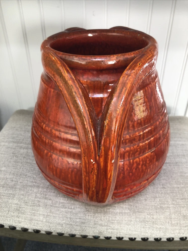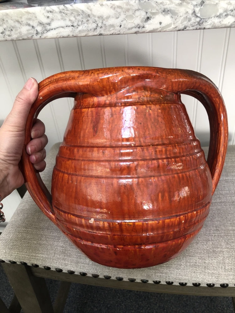 This 1930s North Carolina Cole Pottery apothecary jar/jug is a stunning addition to any collection. With a vibrant red/deep orange drip glaze and double-handled design, it is both functional and decorative. The jug measures 11 inches high and 11.5 inches wide at the handles. It has concentric runs incised horizontally around the body and unique split strap like handles It has one old tight hairline about 2.5 inches long at the rim that looks to possibly be a production or kiln flaw rather than a crack from damage or misuse. Please see photos where I’ve tried to show this. There is one shallow flake off the bottom edge and a few lighter colored spots where the glaze has popped which can be typical of this older folk pottery. This piece is a must-have for any North Carolina pottery collector +++++++++++++++++++++++++ We respectfully ask for payment within 3 days of auction close/end. The items will be carefully packed and shipped within 3 business days of confirmed payment. PLEASE NOTE: IF THE CALCULATED SHIPPING SEEMS HIGH, PLEASE MESSAGE US WITH YOUR ZIP CODE AND WE CAN PROVIDE AN EXACT QUOTE -- WE’RE LOCATED IN NEW ENGLAND SO BUYERS FROM HIGHER ZIP CODES MAY SEE VERY HIGH SHIPPING RATES VIA THE CALCULATOR. MORE THAN HAPPY TO DOUBLE CHECK SHIPPING RATE, SO DO NOT HESITATE TO ASK. Will refund postage if paid is more than .50 over actual We strive to inspect, describe, and photograph my items carefully and accurately. We are knowledgable but not experts or collectors. If you need more information, please ask. International buyers: We do not accept international returns under any circumstances. If you are unhappy with an item, please contact us so we can work something out, other than a return. Thanks for your understanding Shipping charges keep increasing and while we are happy to provide free expert packing labor and materials, we can't help with the cost of shipping. Also, International buyers, please be aware that you may have to pay import tax or customs fees upon delivery. We do not misrepresent the purchase price of items on packing slips. Buyer/winning bidder is responsible for actual shipping We pack with extreme care, but If the item arrives damaged in transit, please take a photo of the item AND the packaging and send it to us immediately. This is necessary for us to complete the paperwork for you in order to issue a full refund