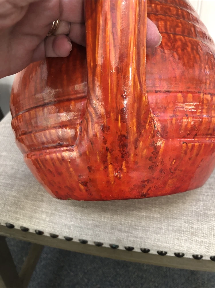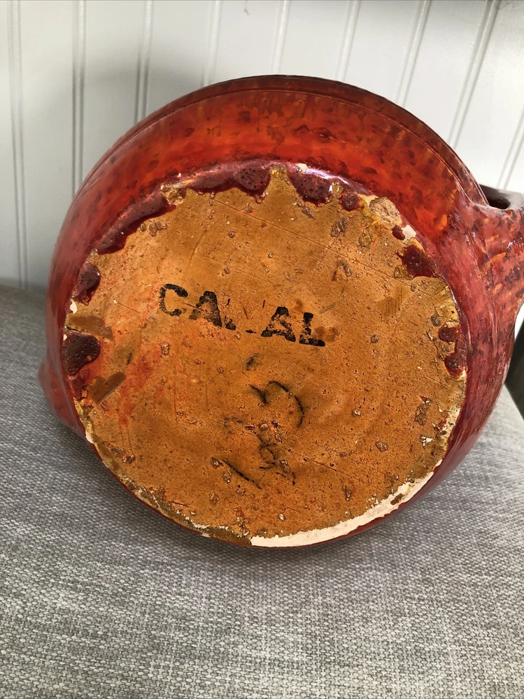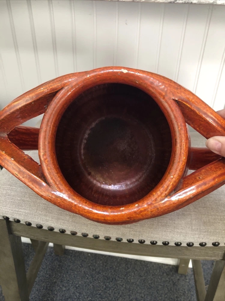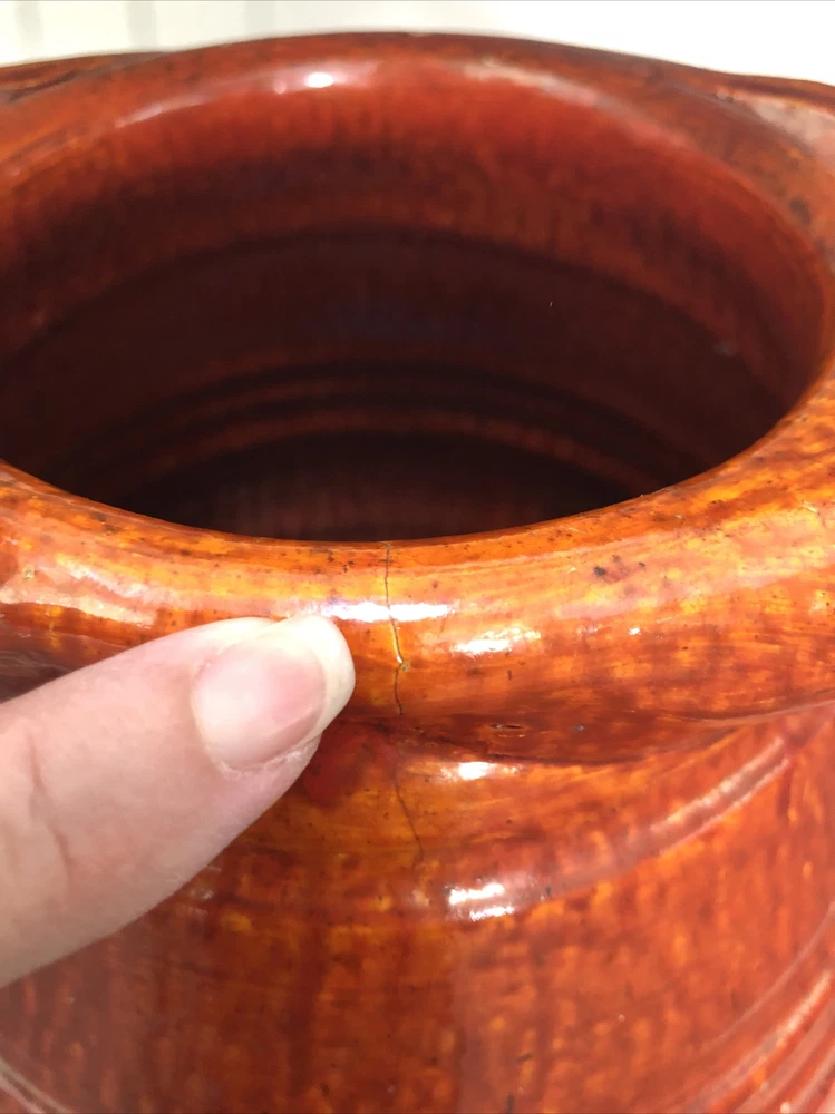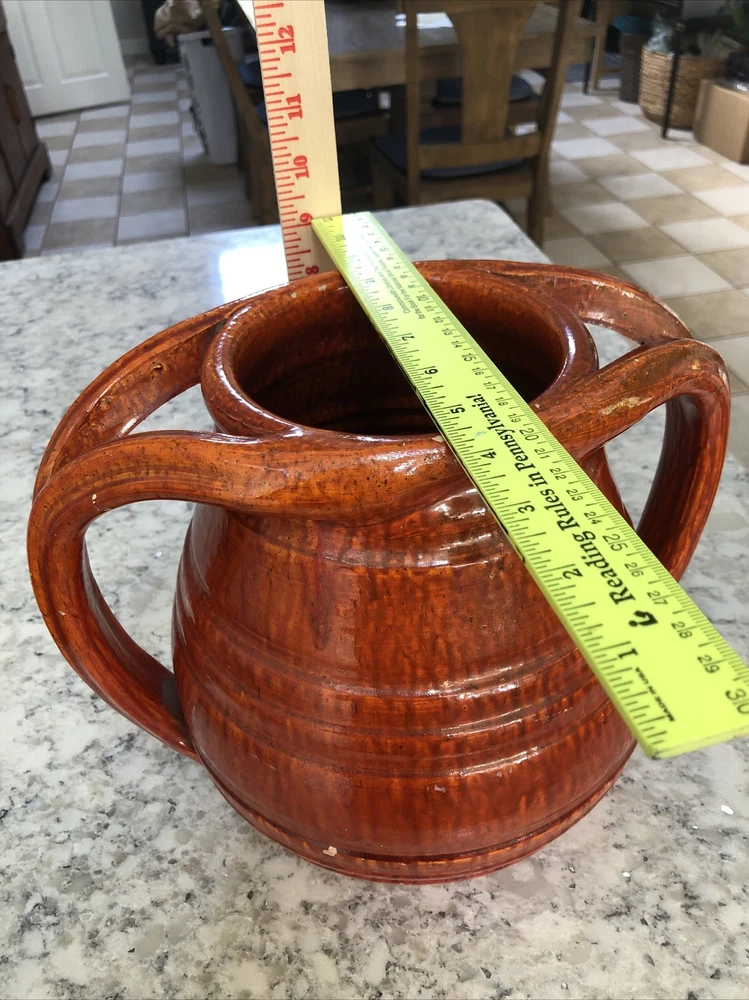 This 1930s North Carolina Cole Pottery apothecary jar/jug is a stunning addition to any collection. With a vibrant red/deep orange drip glaze and double-handled design, it is both functional and decorative. The jug measures 11 inches high and 11.5 inches wide at the handles. It has concentric runs incised horizontally around the body and unique split strap like handles It has one old tight hairline about 2.5 inches long at the rim that looks to possibly be a production or kiln flaw rather than a crack from damage or misuse. Please see photos where I’ve tried to show this. There is one shallow flake off the bottom edge and a few lighter colored spots where the glaze has popped which can be typical of this older folk pottery. This piece is a must-have for any North Carolina pottery collector +++++++++++++++++++++++++ We respectfully ask for payment within 3 days of auction close/end. The items will be carefully packed and shipped within 3 business days of confirmed payment. PLEASE NOTE: IF THE CALCULATED SHIPPING SEEMS HIGH, PLEASE MESSAGE US WITH YOUR ZIP CODE AND WE CAN PROVIDE AN EXACT QUOTE -- WE’RE LOCATED IN NEW ENGLAND SO BUYERS FROM HIGHER ZIP CODES MAY SEE VERY HIGH SHIPPING RATES VIA THE CALCULATOR. MORE THAN HAPPY TO DOUBLE CHECK SHIPPING RATE, SO DO NOT HESITATE TO ASK. Will refund postage if paid is more than .50 over actual We strive to inspect, describe, and photograph my items carefully and accurately. We are knowledgable but not experts or collectors. If you need more information, please ask. International buyers: We do not accept international returns under any circumstances. If you are unhappy with an item, please contact us so we can work something out, other than a return. Thanks for your understanding Shipping charges keep increasing and while we are happy to provide free expert packing labor and materials, we can't help with the cost of shipping. Also, International buyers, please be aware that you may have to pay import tax or customs fees upon delivery. We do not misrepresent the purchase price of items on packing slips. Buyer/winning bidder is responsible for actual shipping We pack with extreme care, but If the item arrives damaged in transit, please take a photo of the item AND the packaging and send it to us immediately. This is necessary for us to complete the paperwork for you in order to issue a full refund