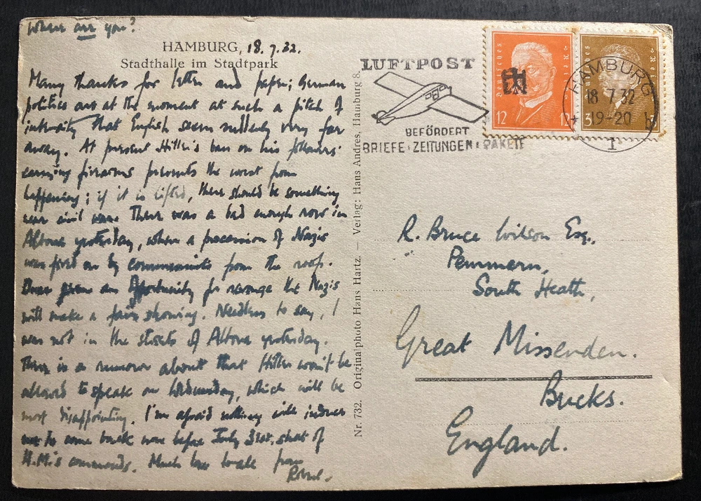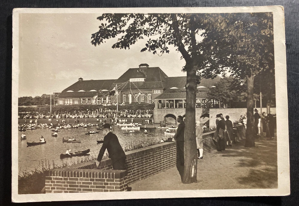 Up for auction is a Real Picture Postcard cover from Hamburg Germany to Bucks England . In good condition . Priced to sell. Very interesting postal history cover. Postmarked In July 18, 1932 .Great stamps marks & cancels . Postcard depicts Stadthalle in the city park. *** For storage & shipping purposes the description page has been removed you only will get the cover ***