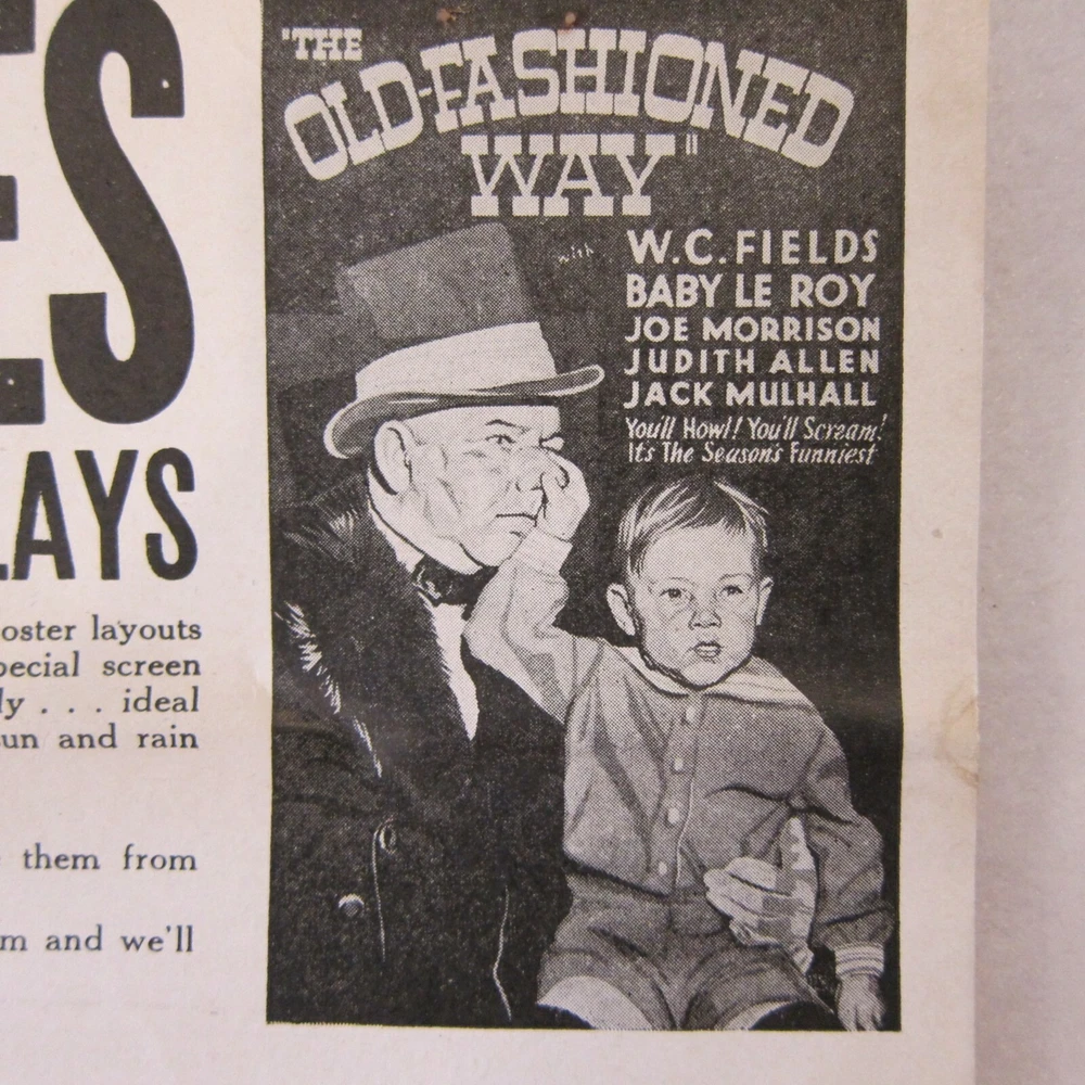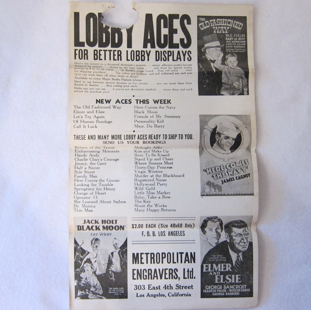 Wray Cagney Fields Lobby Aces 1934 Movie Original Lobby Poster Sampler 9x15 Movie: Various (see photos)The Old-Fashioned Way, Here Comes the Navy, et.al. Actors: WC Fields , James Cagney, Fay Wray, et.al. Studio: Various Measures: 9 x 15” Description: This TWO-SIDED advertising piece was sent out to local movie theatres by the publishing company, Metropolitan Engravers, Ltd., and features - on both sides - a selection of graphics for Lobby Advertising that theaters of the day could choose from. This sampler is printed on heavy newsprint in various shades of black, white, and grey. Condition: Damaged area at the top approximately 1¾" x 1¼" (see photo). With this 87+ year-old paper collectible, you can also expect nicks, possible insect damage, staple holes, rust stains from staples, age discoloration, staining or small tears. It has been folded into fourths so there are three gently rounded crease marks at approximately 4" intervals across its width. Please examine photos of this rare and fragile paper item carefully. Check out our other interesting items !