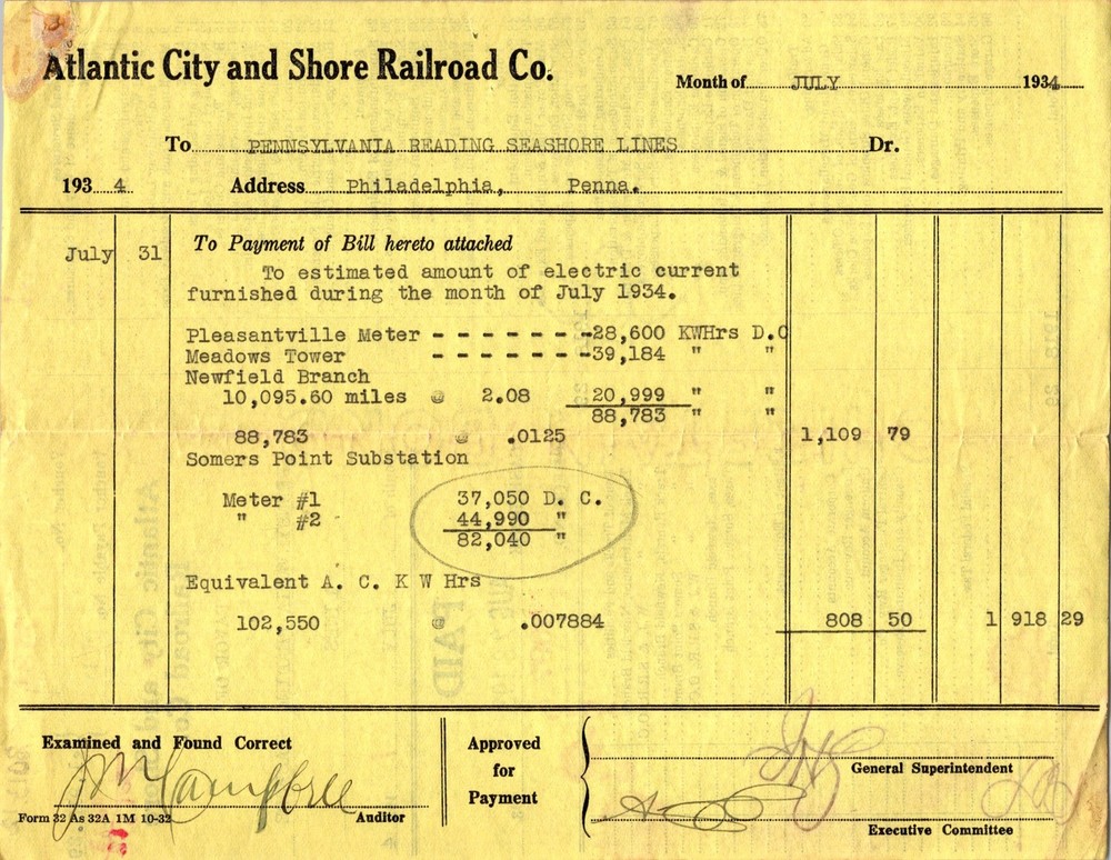 This is a vintage July 1934 billing voucher from the Atlantic City and Shore Railroad Company, issued to the Pennsylvania Reading Seashore Lines for the estimated cost of electric current used during that month. The document, a standard Form 32, itemizes power consumption in kilowatt-hours from key substations and branches of the interurban trolley network, including the Pleasantville meter, Meadows Tower, and the Newfield and Somers Point branches. The total amount due, $1,918.29, is meticulously calculated with typed rates per KWH for both direct and alternating current, reflecting the precise accounting practices of a major transportation utility during the Great Depression. The voucher is formally executed with three authorizing signatures for the Auditor, General Superintendent, and Executive Committee, and bears a "PAID AUG 28 1934" stamp alongside check number 5097, completing its transactional lifecycle. The item serves as a significant artifact of early 20th-century railroad electrification and corporate consolidation in southern New Jersey. Created just one year after the formation of the Pennsylvania-Reading Seashore Lines (PRSL) in 1933, this inter-company billing record documents the operational dependencies and shared infrastructure between the competing rail entities that were merged under the PRSL umbrella. The specific mention of branch lines like the Newfield Branch and Somers Point Substation provides a granular view of the Shore Fast Line's operational geography in Atlantic County. As a piece of Depression-era railroadiana, this voucher exemplifies the bureaucratic ephemera of corporate finance, from its pre-printed ledger categories for way and structures, equipment, and conducting transportation to its final validation as a paid invoice, offering direct insight into the cost structures and administrative interactions that underpinned regional transit during the interwar period.