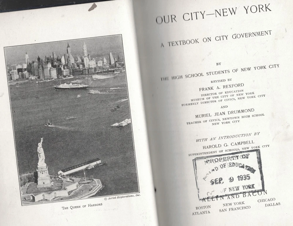 FROM 1935, a rare New York City first edition. Our City, New York, by the High School Students of New York City. Revised by Frank A. Rexford, and Muriel Dean Drummond. Published by Allyn & Bacon, New York. Note the 1935 rubber stamp from the City of New York, and a second one from Boys' High School in Brooklyn, signed by student Warren Weil. We tried to imagine today's NYC high school students producing a book like this, and we gave up. Great condition. Lots of maps and photographs.