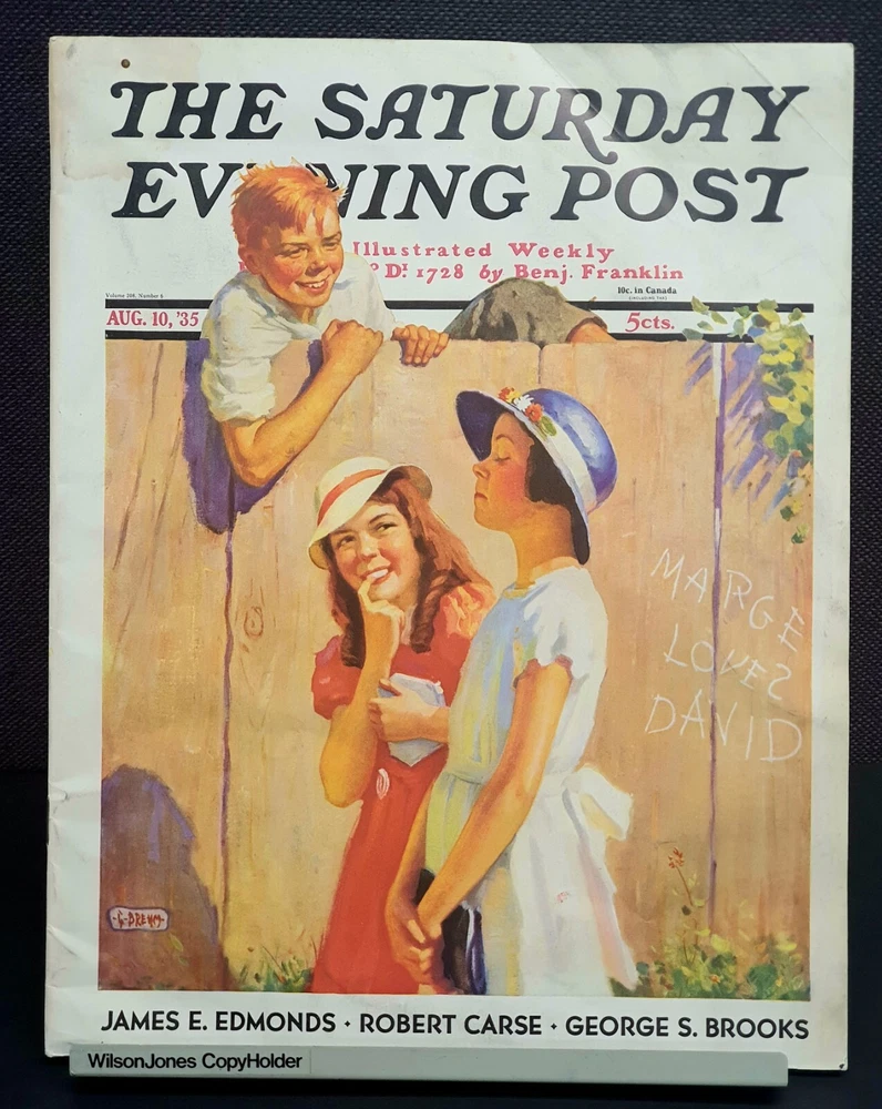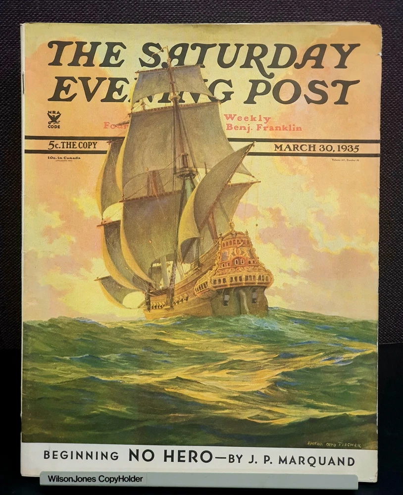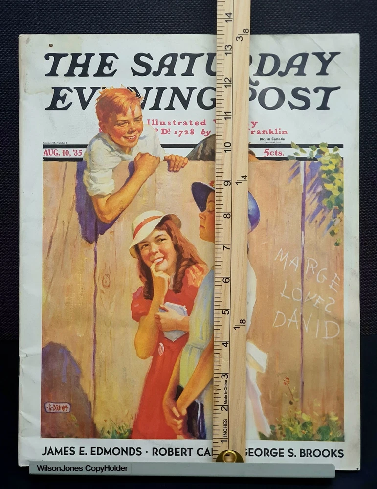 Both issues are in Very Good Plus condition with no loose or missing pages. The March 30, 1935 issue of The Saturday Evening Post features a cover illustration titled “Spanish Galleon” by Anton Otto Fischer. This issue has 107 numbered pages. The August 10, 1935 issue of The Saturday Evening Post features a cover titled “Marge loves David,” created by artist George Brehm. This issue has 84 numbered pages. The Saturday Evening Post is an American magazine, currently published six times a year. It was published weekly from 1897 until 1963, and then every other week until 1969. From the 1920s to the 1960s, it was one of the most widely circulated and influential magazines among the American middle class, with fiction, non-fiction, cartoons and features that reached two million homes every week. The Saturday Evening Post was first published in 1821 in the same printing shop at 53 Market Street in Philadelphia, where the Benjamin Franklin-founded Pennsylvania Gazette was published in the 18th century. While the Gazette ceased publication in 1800, ten years after Franklin's death, the Post links its history to the original magazine. Cyrus H. K. Curtis, publisher of the Ladies' Home Journal, bought the Post for $1,000 in 1897. Under the ownership of the Curtis Publishing Company, the Post grew to become the most widely circulated weekly magazine in the United States.