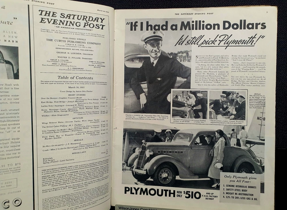Publication Month: March, August Publication Name: Saturday Evening Post Genre: Action & Adventure, Activity, Fashion, Food & Drink, Health, Home & Garden, Humor & Satire, Illustration, Lifestyle Publication Year: 1935 Language: English Seller Notes: “Both issues are in Very Good Plus condition with no loose or missing pages.” Country/Region of Manufacture: United States