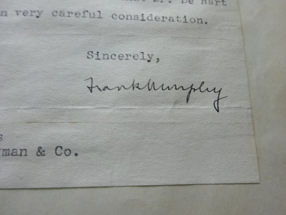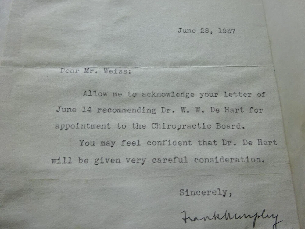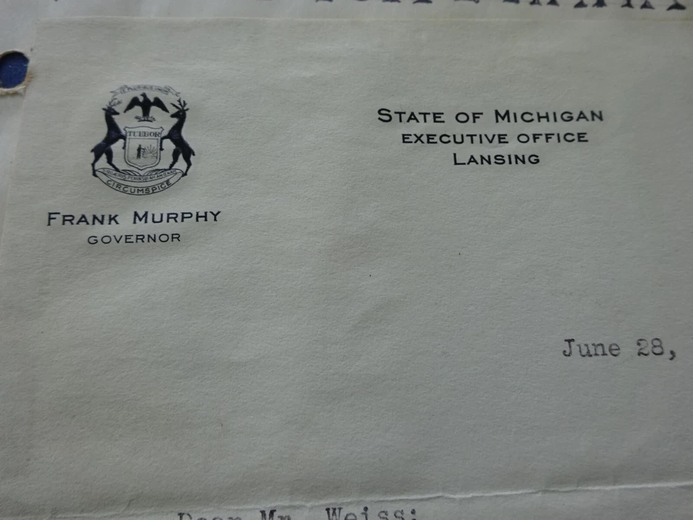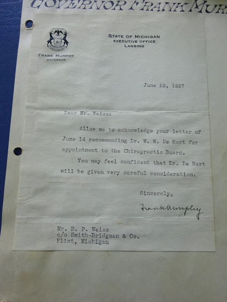 This is an original letter written on State of Michigan Governor stationery dated June 28, 1937. Signed by Governor Frank Murphy who was from Harbor Beach, Michigan. The letter acknowledges a recommendation for the Chiropractic Board by H.B. Weiss of Flint. Original authentic letter. Murphy was Governor of Michigan from 1937 to 1939 and later on the US Supreme Court from 1940 to 1949.