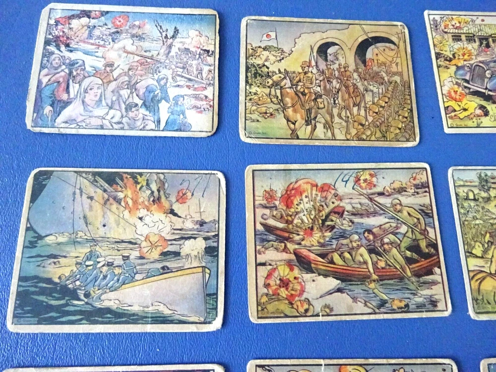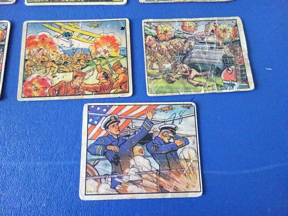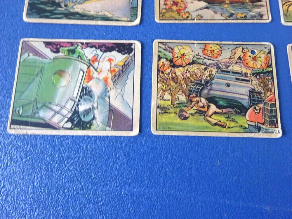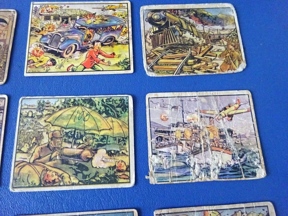 This is a 13 card lot for 1938 Horrors of War cards. Lower grade with cards having some issues. 3 have writing on the front and 2 have heavy creases.2 have a tiny hole. The following cards are included. 45, 53,54, 79.81, 89-doubles, one is really rough,97, 102, 103, 111, 159, 189.