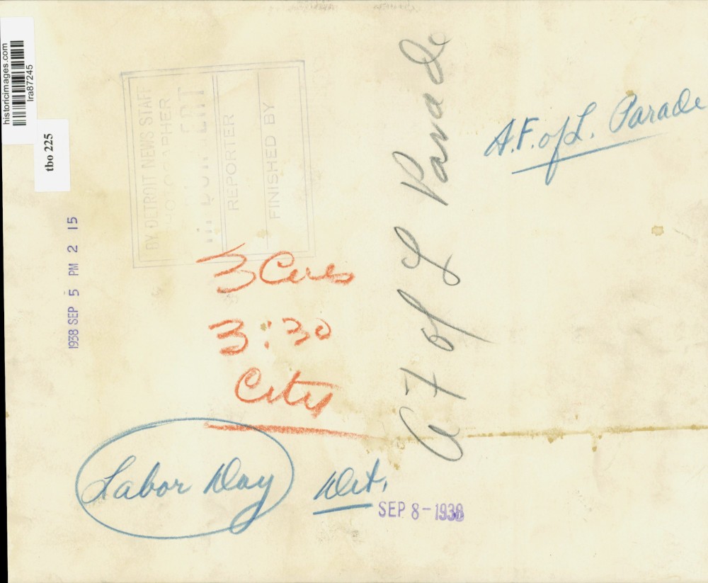 ebay template Note: Please study the images carefully to determine the condition of this vintage photograph, as it may not be in perfect condition. It may contain wrinkles, cracks, and possibly even tears due to its age and how it was handled before it got to us. A scanner may interpret colors and contrast differently than human eyes will, so it is possible that the actual photograph may be slightly darker or lighter in person. This vintage photograph is offered for sale as a collectible item and conveys no transfer of copyright. 1938 Press Photo Members of the A.F. of L. march at Labor Day Parade in Detroit This is an original press photo. Labor Day in Detroit - A.F. of L. Parade Photo is dated 9/5/1938. Photo measures 9.75 x 8 inches.. PHOTO FRONT PHOTO BACK Historic Images Part Number: lra87245 FAQs Q: Can I just download a digital version instead? A: No, we sell only vintage originals and do not make or distribute any copies, including digital ones. Q: Do you combine shipping and invoices? A: Multiple photos won on the same seller ID combine automatically through the eBay checkout process. If you encounter problems with this, send us a message via eBay messaging and we will send you an invoice. Due to eBay limitations, we cannot combine items won on our different seller IDs for a single shipping charge. Q: How quickly do you ship the items once paid? A: We ship within one business day after your payment clears. If you do not receive an "order shipped" email from us by the close of the second business day from submitting payment, please e-mail us via eBay messaging. Q: How do you make sure my photograph arrives safely? A: We package each order between two cross-corrugated pieces of cardboard to ensure that the package is as difficult to bend as possible. We then wrap each order in a plastic sheet to help protect against moisture. We want you to rest assured that we take every precaution to ensure that the photograph you receive will be in the same condition in your care as it was in ours. Q: Will the "Historic Images" watermark be on my photo when I receive it? A: No. This is a digital watermark we use to protect our images. It is not printed on the photo. Q: What are your office hours? A: eBay for us is a business, and a very fun one to be in! We are open M-F 9 to 5 (CST). Therefore, we do not return e-mails and phone calls over the weekend. We observe the following holidays: New Years Day, Memorial Day, Fourth of July, Labor Day, Thanksgiving and the day after Thanksgiving, Christmas Eve and Christmas Day. Q: Where did all these vintage photos come from? A: These original vintage photographs are from various news service and newspaper photo archives from locations around the country including: Boston, Detroit, Tampa, Chicago, Denver, Seattle, New Orleans, Milwaukee, Portland, Spokane, and more. We do not copy or reproduce any photographs -- every item is a unique vintage piece that was housed in a news archive. Q: Can I use this photograph in my book/blog/website? A: The short answer is no. There is no transfer of copyright for republication or reproduction with these photographs when you purchase them, and only photographs taken before 1923 are currently automatically in the public domain. Permission from the copyright holder, which usually can be identified from the back of each photo, must be sought to republish or reproduce the image for any purpose. Q: Do you relist items (in case I miss an auction ending)? A: Auction items that receive no bids are relisted in our store (historicimages-store on eBay) as a fixed-price item and at a higher price than the starting auction price. Q: Do you leave feedback? A: Yes, we always leave feedback for buyers. Our software monitors when our buyers leave us feedback, then notifies us that we can leave feedback for the buyer. Rest assured, if you leave feedback, we will do the same! Check out our family of eBay IDs: historicimages01 Sports Photos historicimages02 Entertainment Photos historicimages03 Americana Photos historicimages04 International & War Photos historicimages05 Transportation Photos historicimages06 Photos of All Subjects historicimages07 Entertainment Photos historicimages08 Newsworthy Photos historicimages09 Entertainment Photos historicimages10 Sports Photos historicimages-store Our largest fixed-price selection historicimages-gallery Hand-picked photos Saturday night auctions About Us Historic Images was formed in September 2009, with a handful of scanners working out of a basement to digitize newspaper photo archives. We have since moved out of the basement, and we can now archive thousands of photos per day. Our company has worked with magazines and newspapers from Detroit, Boston, Denver, Seattle, Tampa, Chicago, and New Orleans, just to name a few. We are constantly adding to our inventory, and have assembled an archive of millions of photos to date. As our company evolved, we began our eBay business, which brings thousands of fresh auctions per week to the world's largest online auction marketplace. Our custom software systems and team of great employees allow us to efficiently scan and sell large photo archives online. At the very core of our company's DNA is a strong commitment to customer satisfaction and strict integrity for our product. Our promise to you is that we will do everything in our power to provide you a great buying experience. Copyright 2009 - Present, Historic Images, Inc. Sell Smarter with Kyozou. Inventory and Ecommerce Management